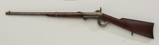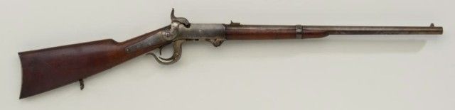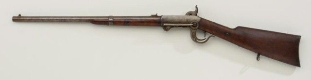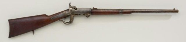 5th Model Burnside breech loading Civil War carbine 58 cal percussion, serial #12313. The carbine remains in original good to very good condition with a patina finish showing faint traces of original colors. The smoothmetal shows some fine pinprick pitting with good edges and markings. The stocks are good to very good with 2 lightly visible cartouches. The fore end show some dings, dents and mars. The butt stock is at leastvery good. The action is good, bore is very good but dirty and may clean to excellent. All original small parts. From a N.Y. collector’s estate. Est.;$1,000-$2,000.