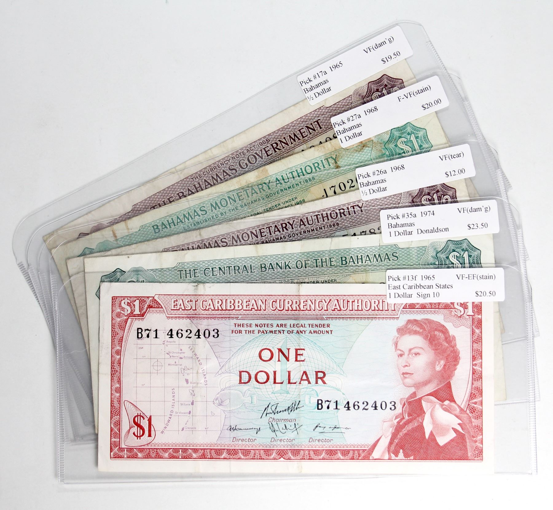 5x 1965-1974 World Banknotes in Fine to EF Condition. Lot Includes: Pick #13f, 1965 East Caribbean States $1, Sign 10, VF-EF; Pick #17a, 1965 Bahamas 1/2 Dollar, VF; Pick #27a, 1968 Bahamas $1, F-VF; Pick #26a, 1968 Bahamas 1/2 Dollar, VF; & Pick #35a, Bahamas $1, Donaldson, VF. Notes contain various imperfections. 5pcs.
