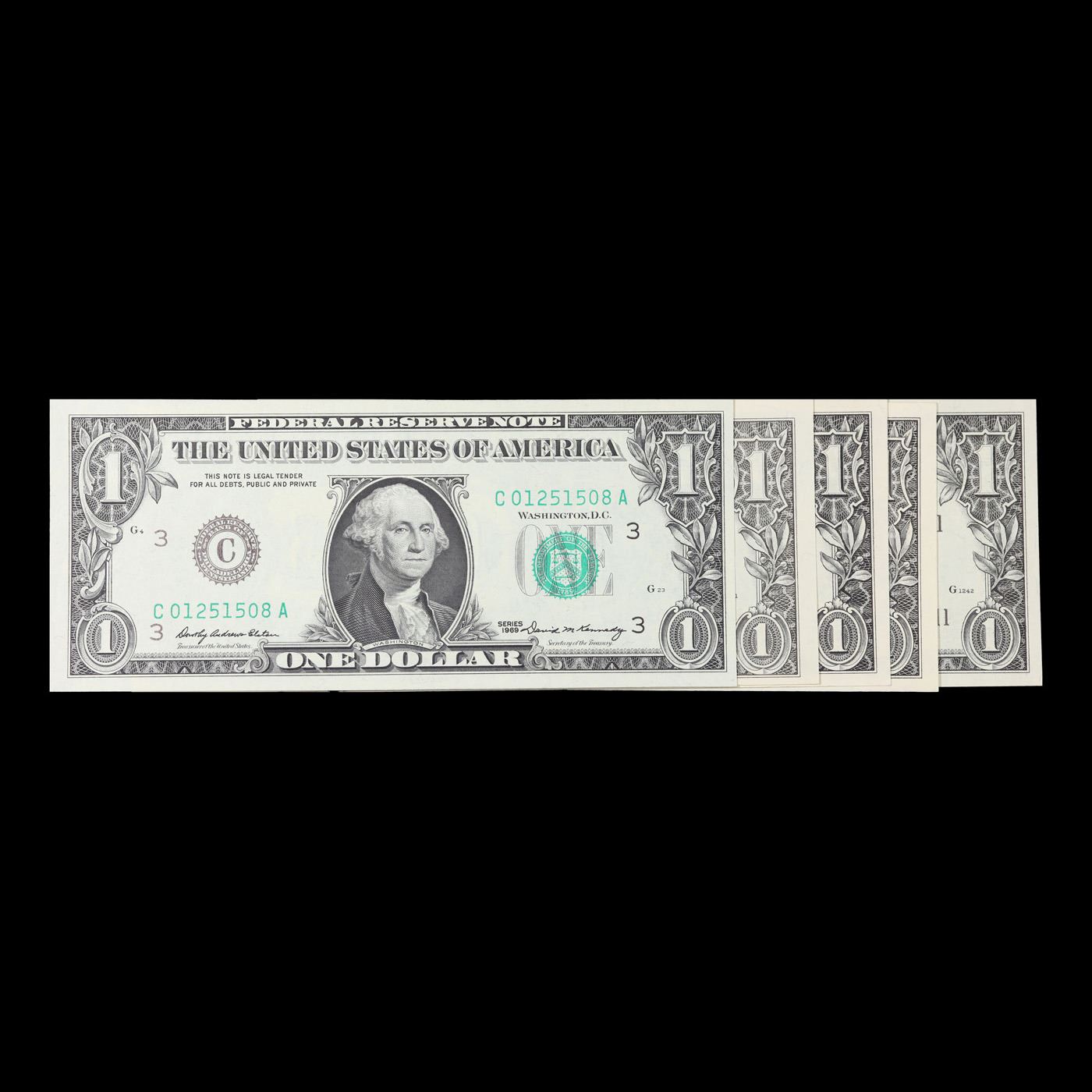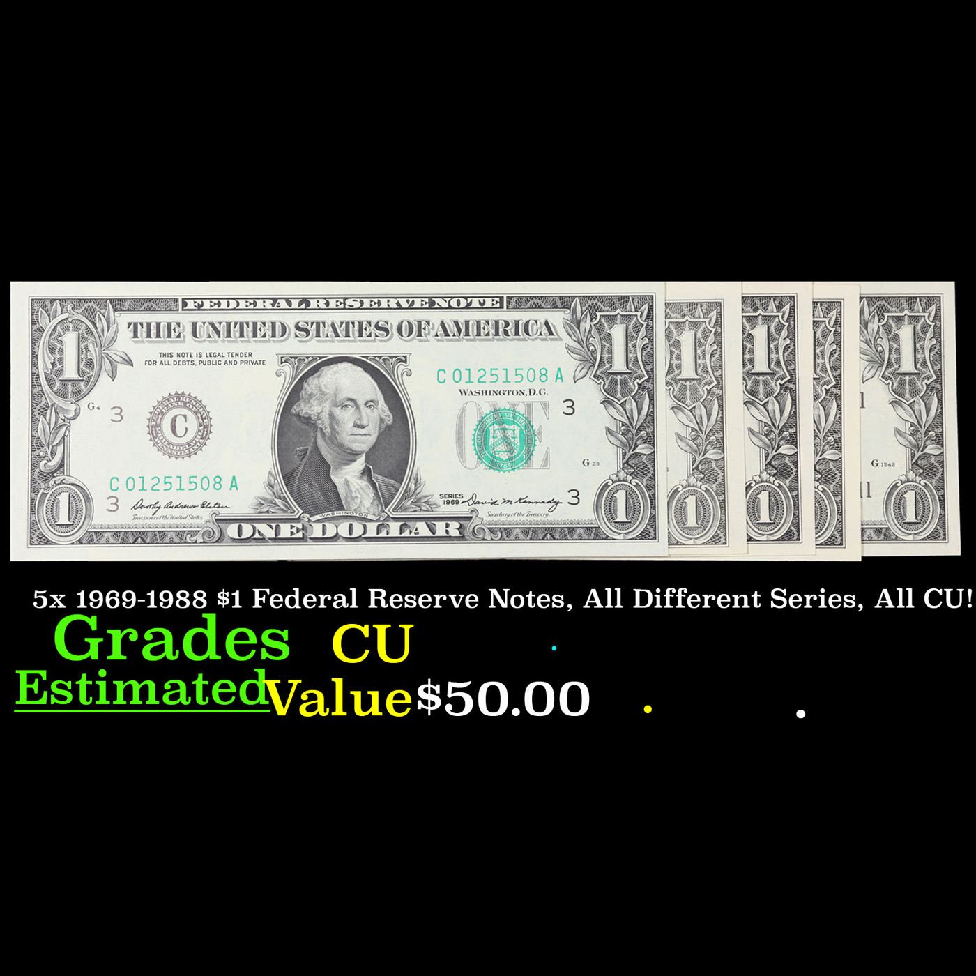 5x 1969-1988 $1 Federal Reserve Notes, All Different Series, All CU! Grades CU.
