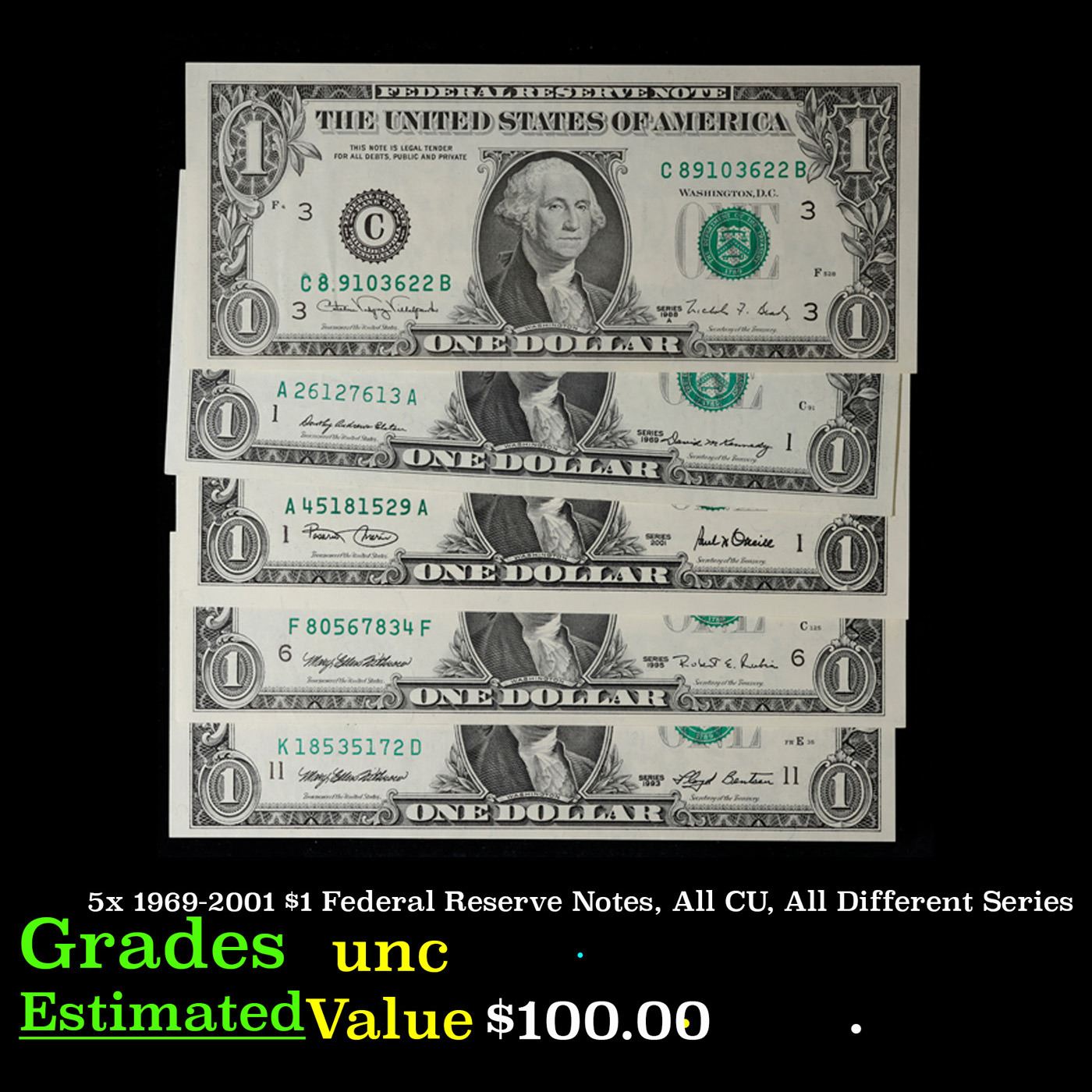 5x 1969-2001 $1 Federal Reserve Notes, All CU, All Different Series Grades Brilliant Uncirculated.