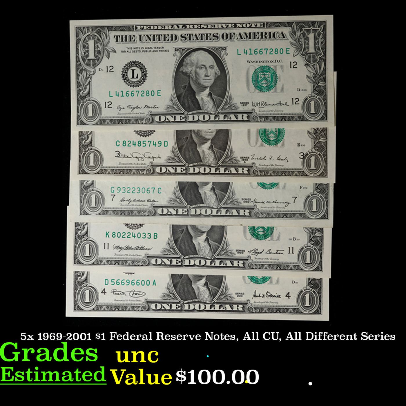 5x 1969-2001 $1 Federal Reserve Notes, All CU, All Different Series Grades Brilliant Uncirculated.
