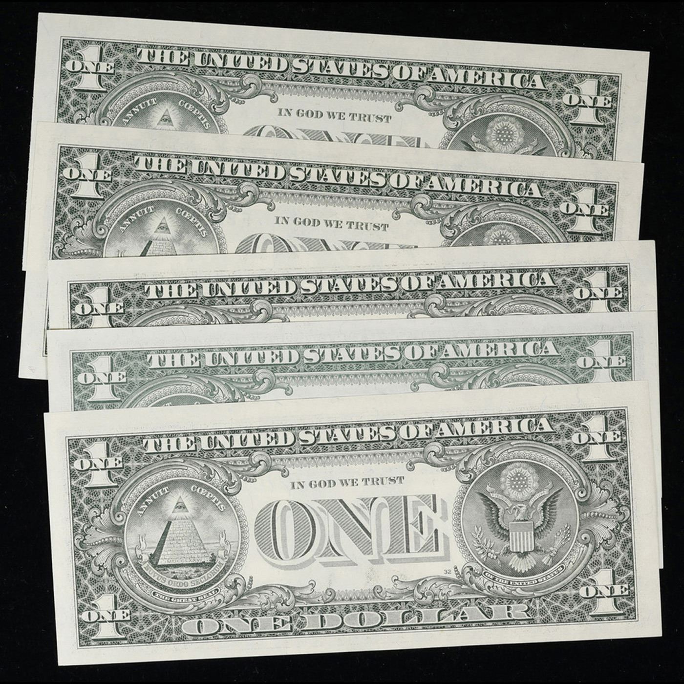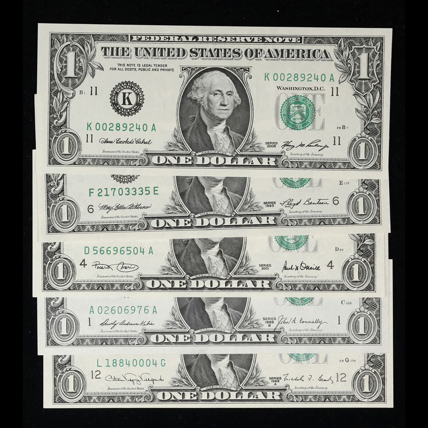 5x 1969-2006 $1 Federal Reserve Notes, All CU, All Different Series Grades Brilliant Uncirculated
