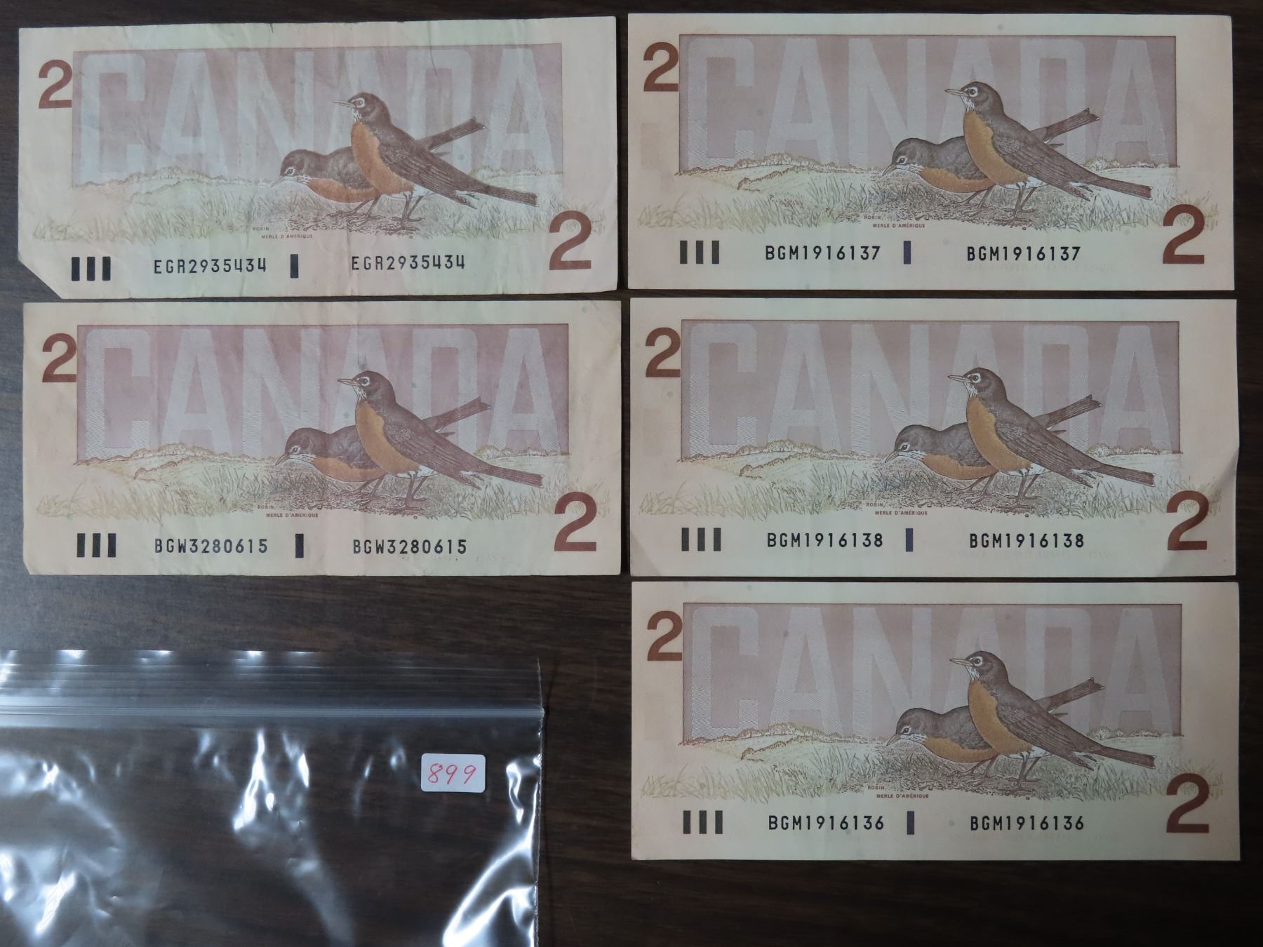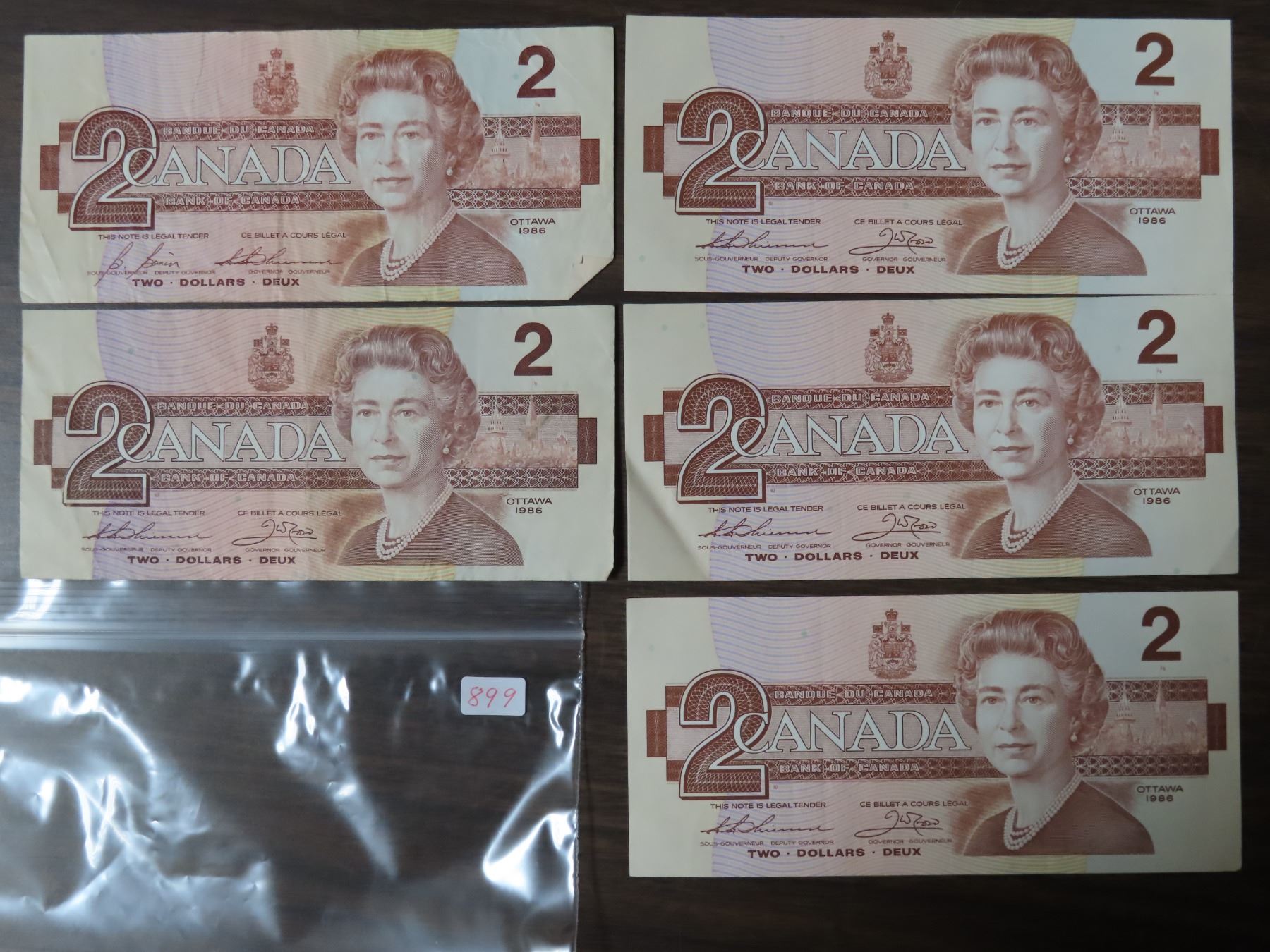 5x 1986 Canada 2 dollar bird bills (3 are in sequence)