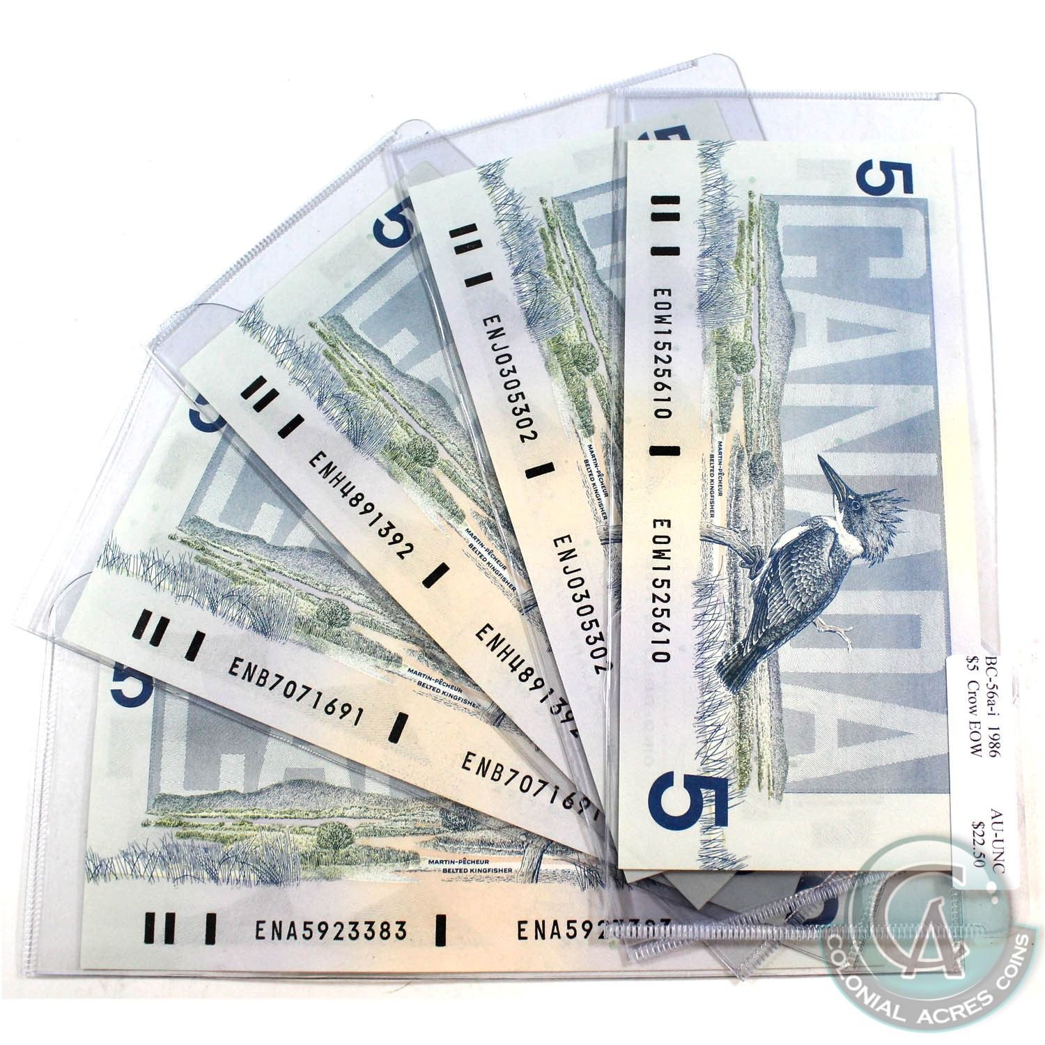 5x 1986 Canada $5 'Crow' Notes with All different Prefixes in AU-UNC Condition. ENA, ENB, ENH, ENJ, and EOW. 5pcs.