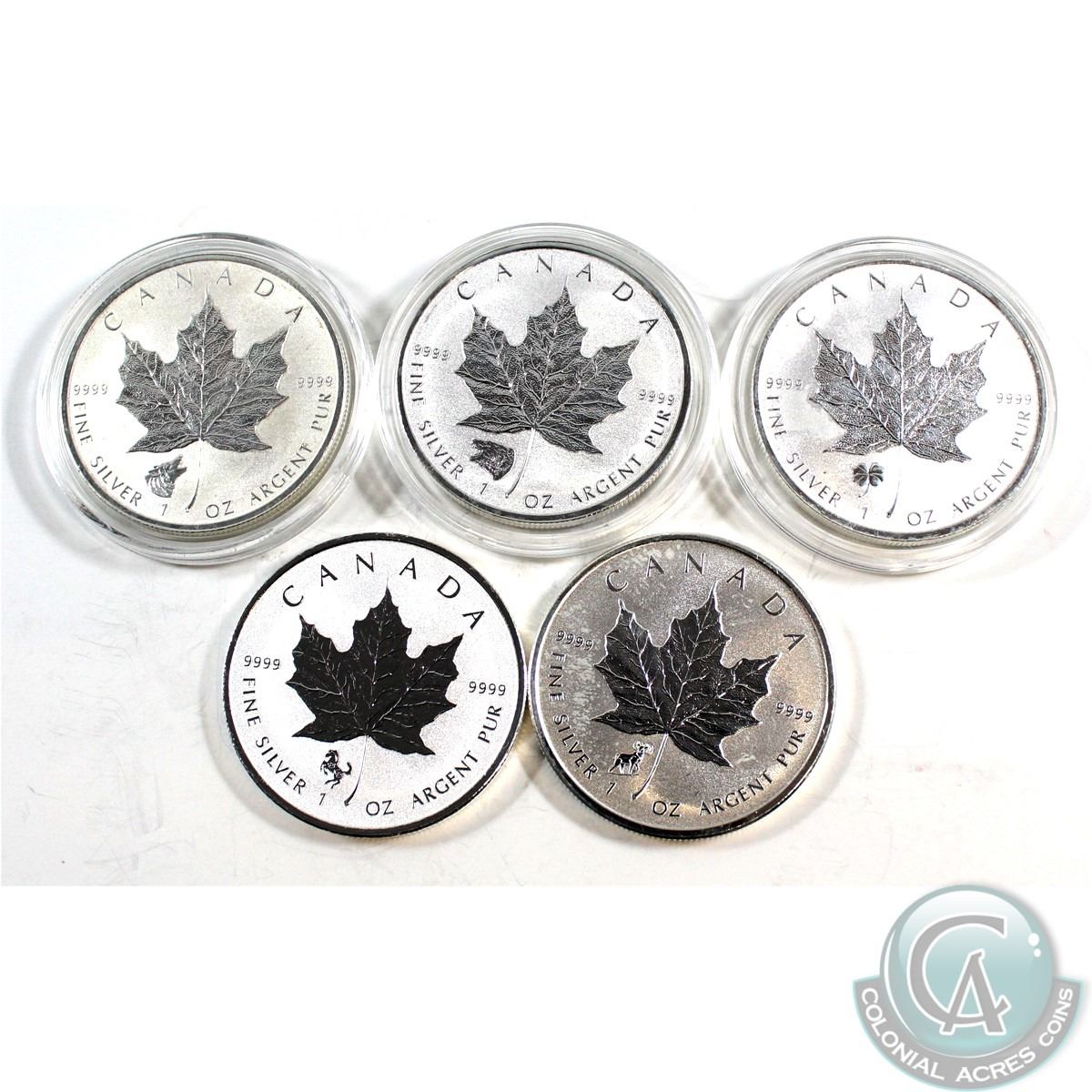 5x 2014-2016 Canada $5 Privy Mark 1oz .9999 Silver Maple Leafs. You will receive: 2014 Horse Privy, 2015 Sheep Privy, 2016 Four Leaf Clover Privy, 2016 Wolf Privy and 2016 Grizzly Privy Silver Maple Leafs (TAX Exempt). Coins contain toning spots. 5pcs