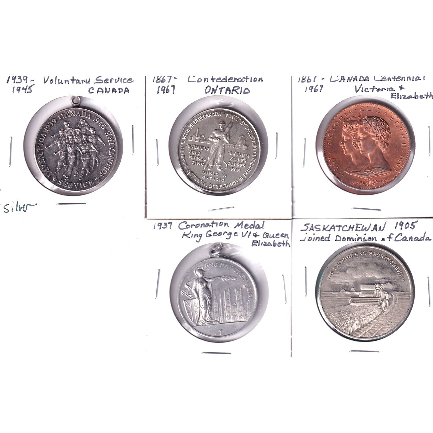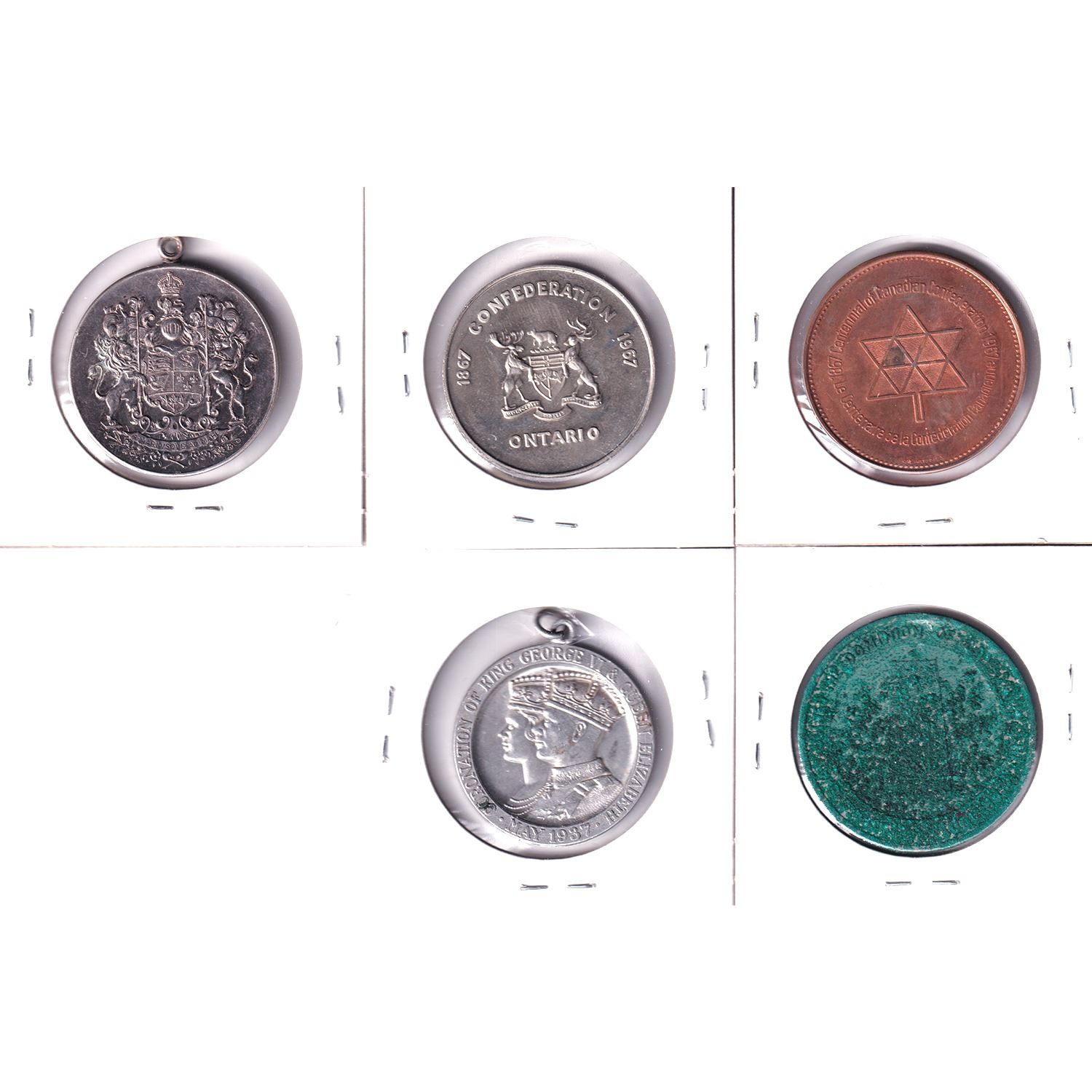 5x Canada 1937-1967 Assorted Tokens & Medals. Lot Includes: 1937 King George VI & Queen Elizabeth Coronation Medal, 1939-1945 Voluntary Service Medal, 1867-1967 Confederation Ontario, 1867-1967 Canada Centennial Victoria + Elizabeth, & 1967 Wellings Mint-Saskatchewan (corr). 5pcs.