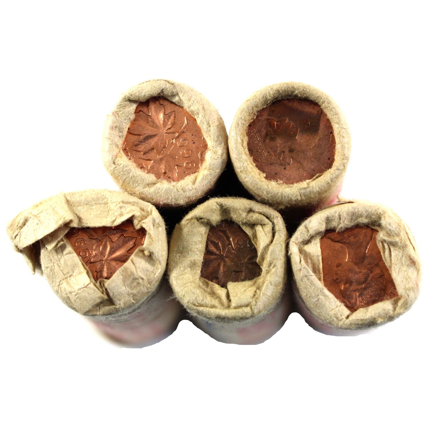 5x Canada 1965 1-cent Rolls of 50pcs. Lightly toned. Paper loose on some rolls. 5 Rolls.