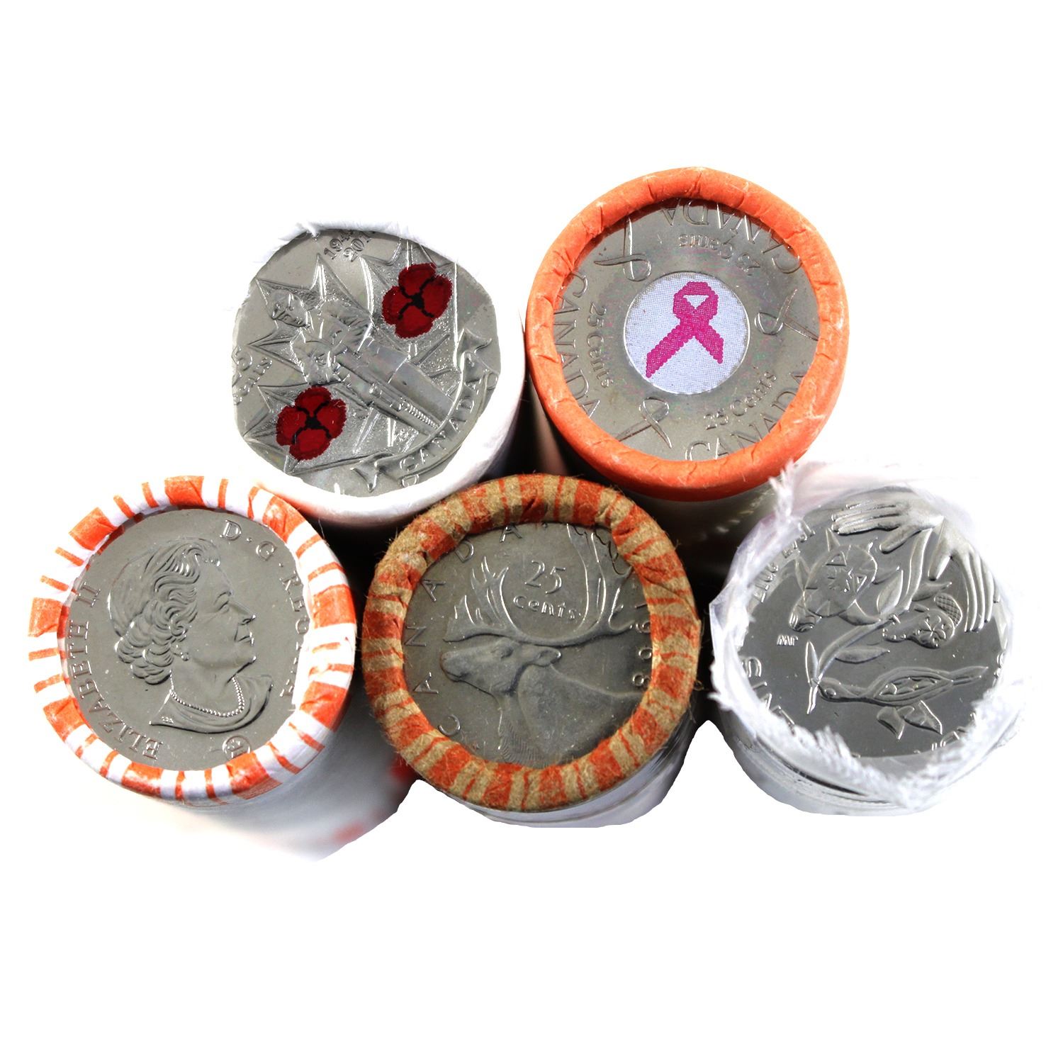 5x Canada 1968-2017 25-cent Rolls of 40pcs. Some Colour. Lot Includes: 1968, 2006P Pink Ribbon, 2010 Coloured Poppy, 2014 Double Headed, & 2017 Hope for the Future-Non Colour. 5 Rolls.