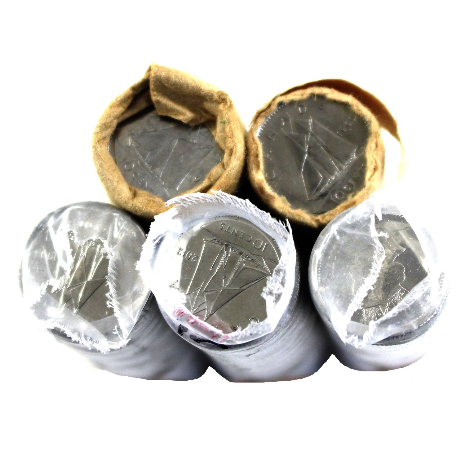 5x Canada 1969-2012 10-cent Rolls of 50pcs with Some Incomplete. Lot Includes: 1969, 1977 (incomplete), 1995, 1999, 2012. Paper torn and loose on some rolls. 5 Rolls.