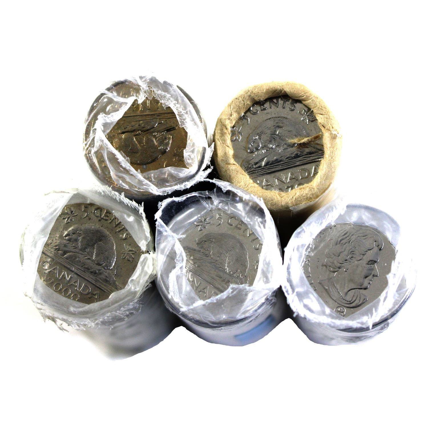 5x Canada 1970-2010 5-cent Rolls of 40pcs. Lot Includes: 1970, 1999, 2000, 2009, & 2010. 5 Rolls.