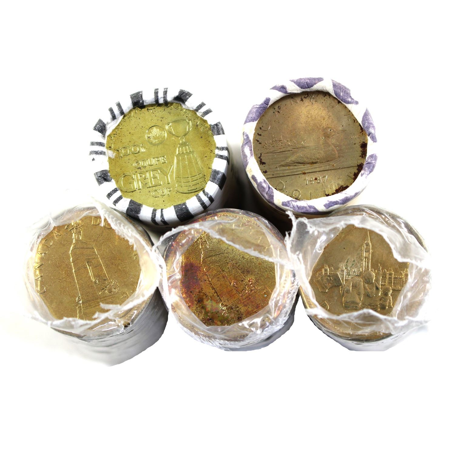 5x Canada 1987-2012 Loon $1 Rolls of 25pcs. Lot Includes: 1987, 1992 Parliament, 2x 1994 Memorial, 2012 Grey Cup. Natural hues of deep russet to soft pink. 5 Rolls.