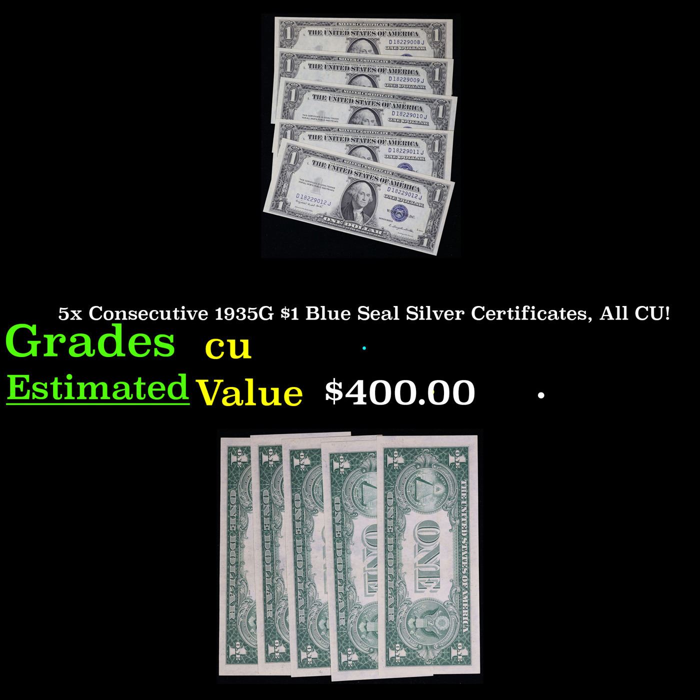 5x Consecutive 1935G $1 Blue Seal Silver Certificates, All CU! Grades CU.