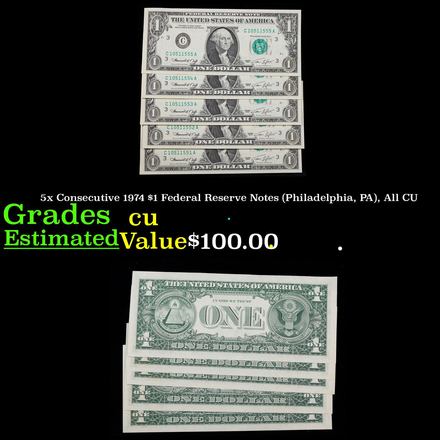 5x Consecutive 1974 $1 Federal Reserve Notes (Philadelphia, PA), All CU Grades CU.