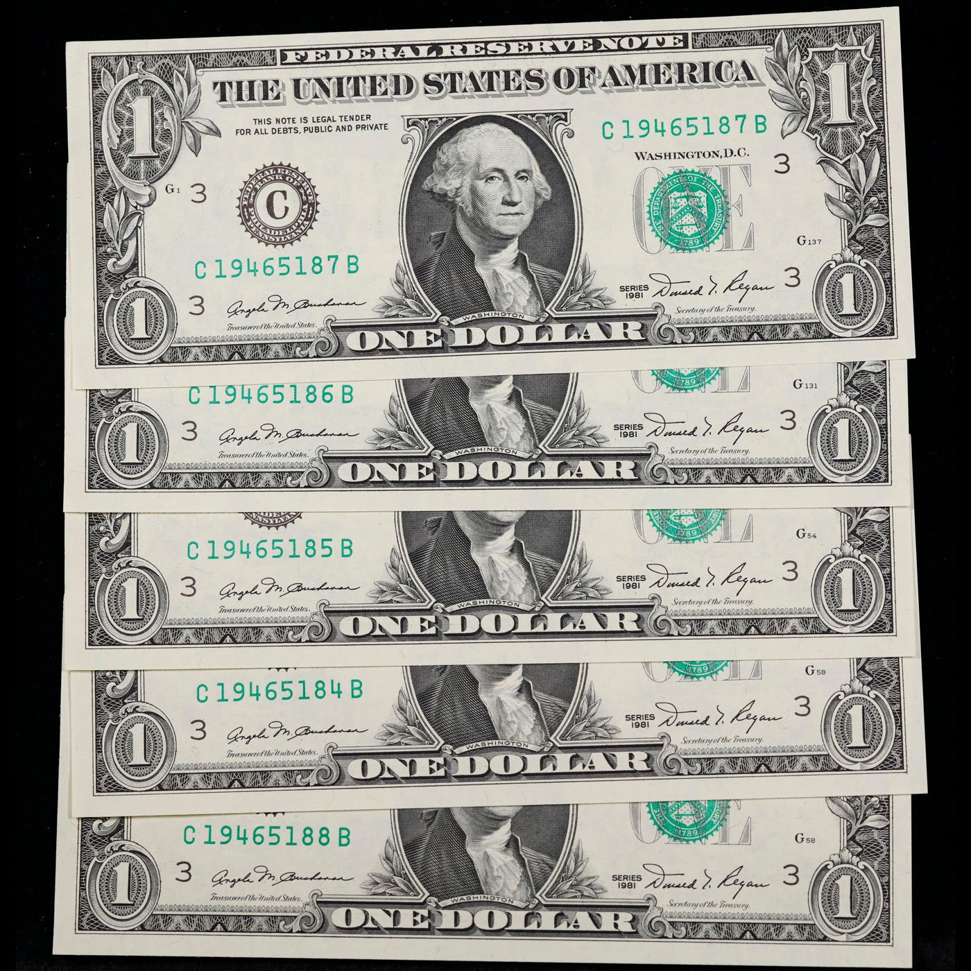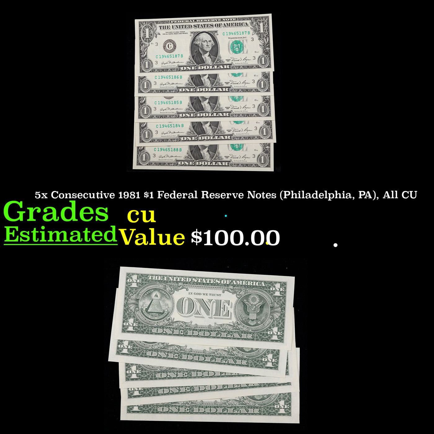 5x Consecutive 1981 $1 Federal Reserve Notes (Philadelphia, PA), All CU Grades CU.