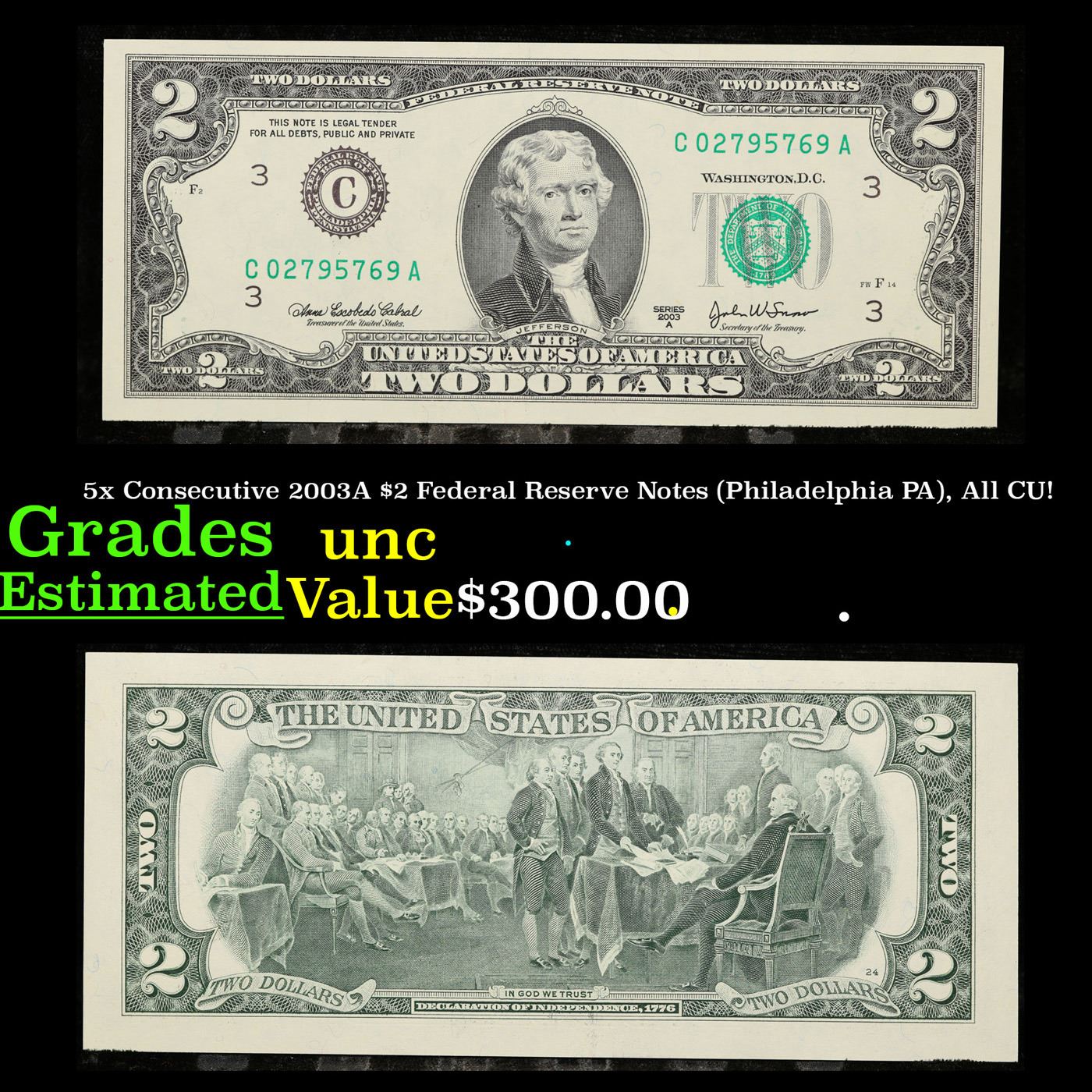 5x Consecutive 2003A $2 Federal Reserve Notes (Philadelphia PA), All CU! Grades Brilliant Uncirculated.