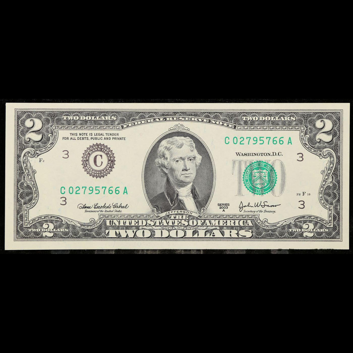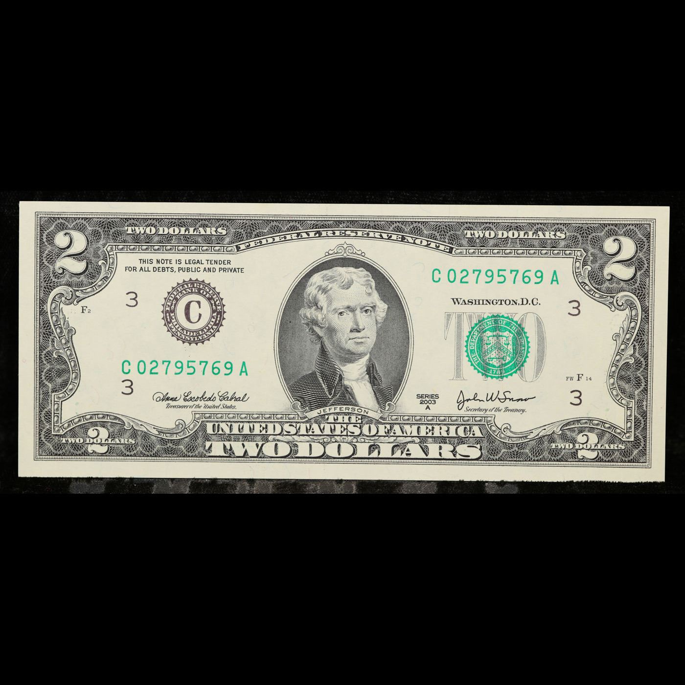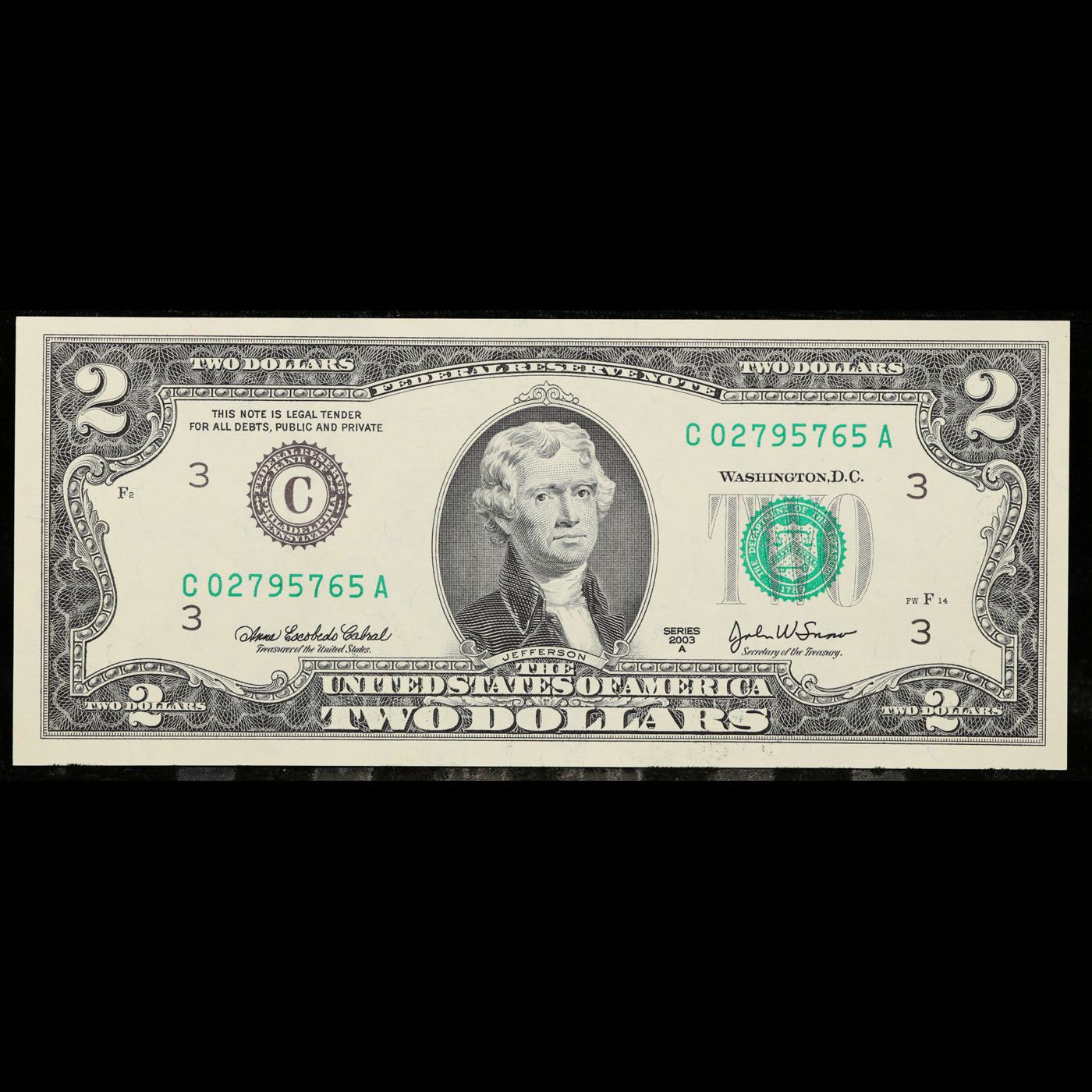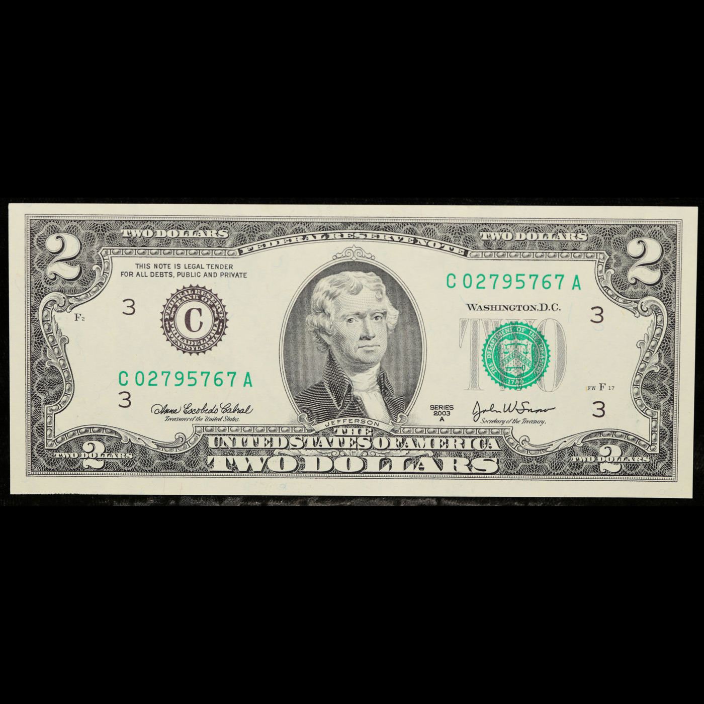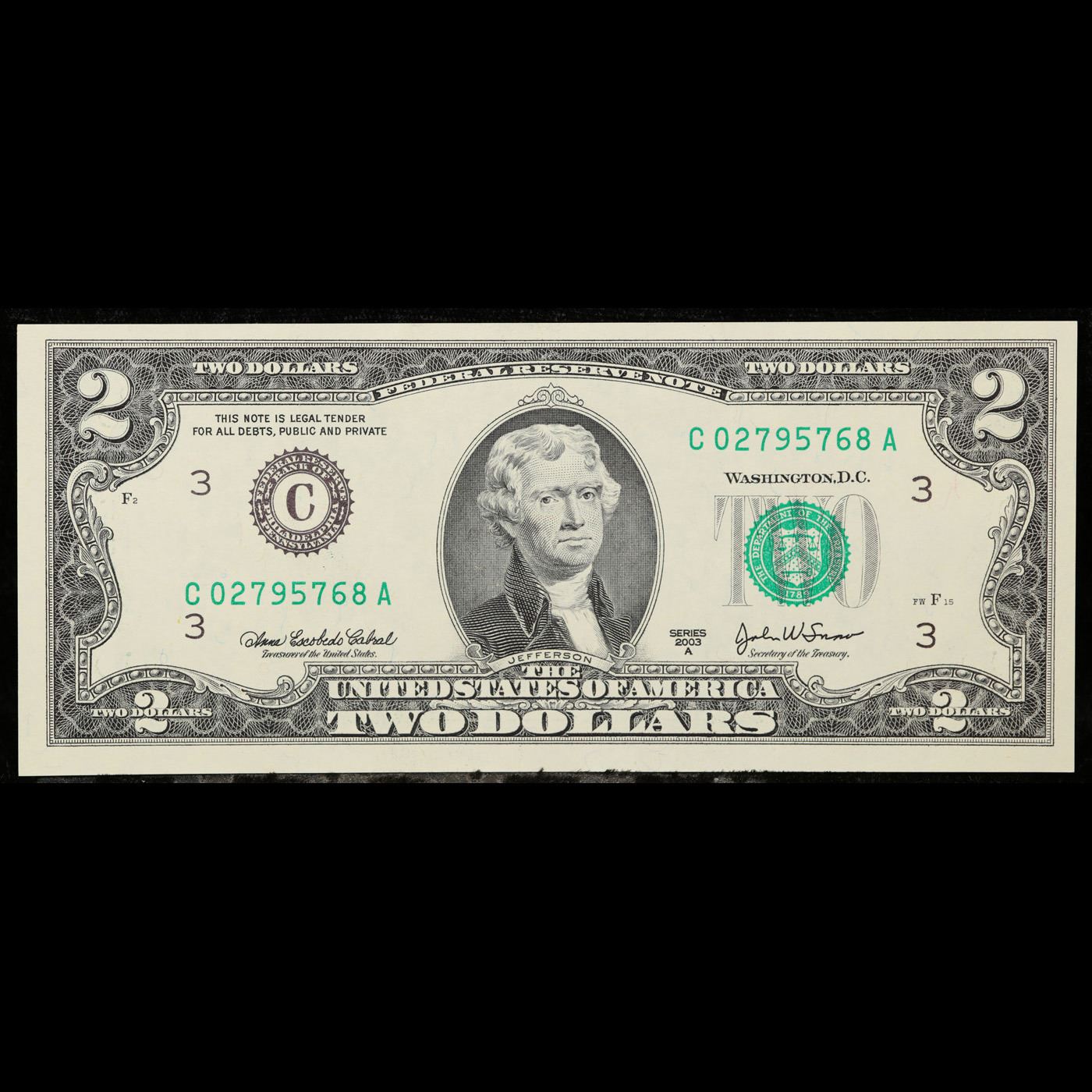 5x Consecutive 2003A $2 Federal Reserve Notes (Philadelphia PA), All CU! Grades Brilliant Uncirculat