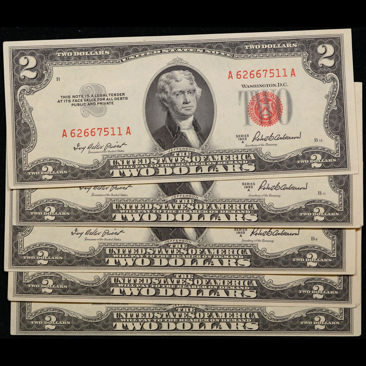 5x Consecutive Serial 1953A $2 Red Seal United States Notes, all CU Grade Grades Choice CU