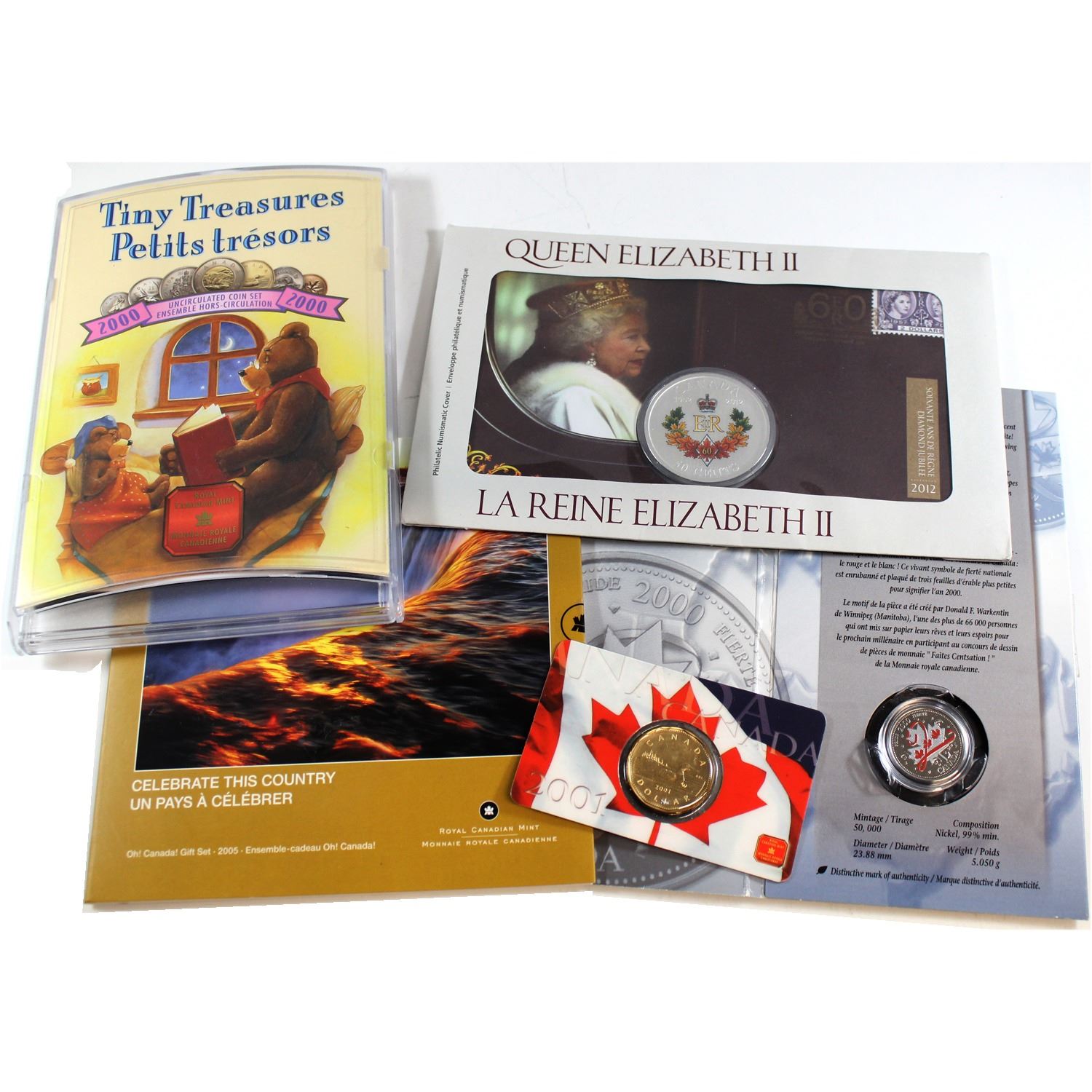 5x Mint Collector Coins and Sets: 2000 Pride Canada Day "PRIDE" coloured 25-cent, 2000 Tiny Treasures Baby Gift Set (scuffed holder), 2001 Canada $1 in colourful display card, 2005 Oh Canada Gift Set & 2012 Queen Elizabeth Jubilee 50-cent First Day Coin and Stamp Cover. 5pcs