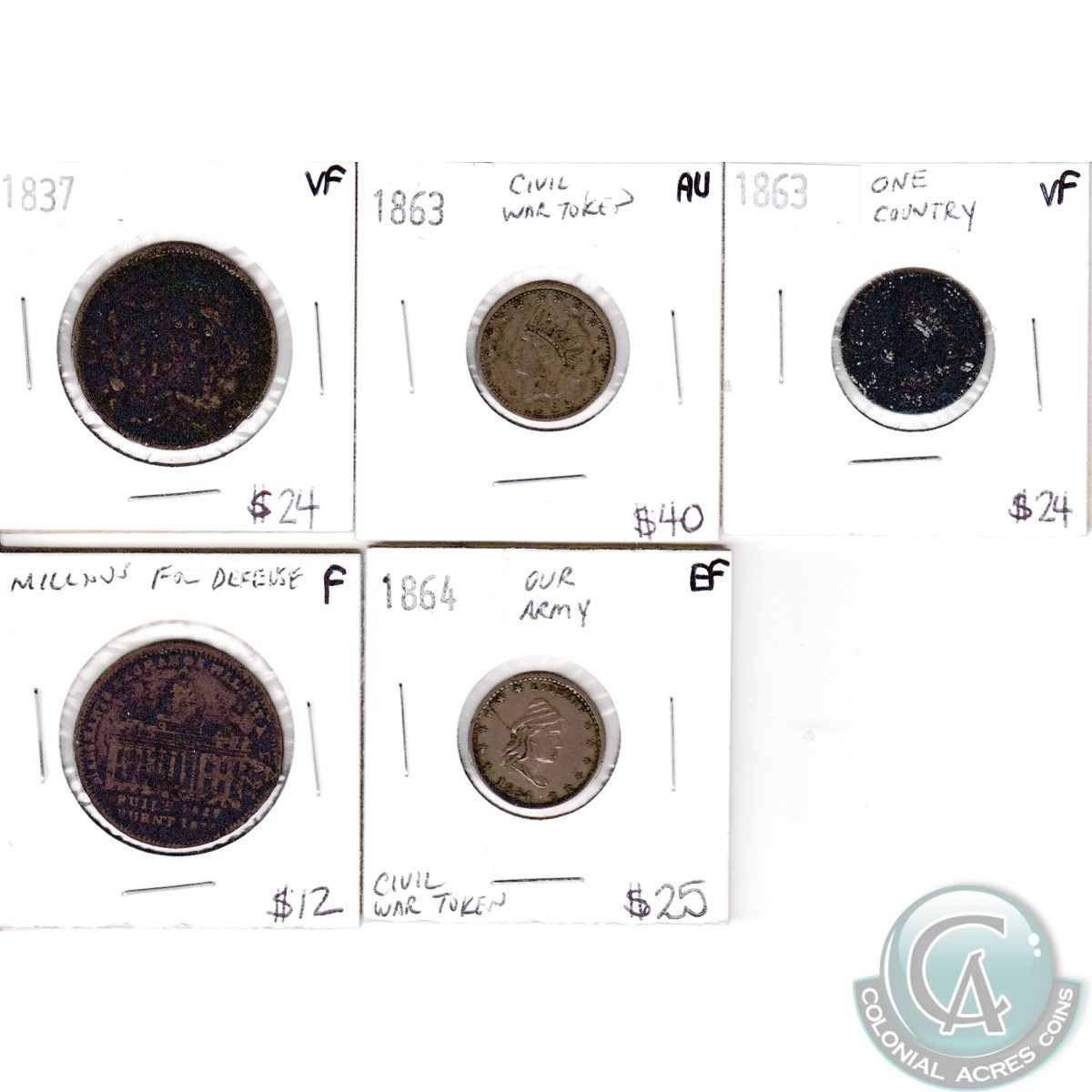 5x USA War Tokens: 1837 Hard times Not One Cent Token VF, 1863 Civil War Token AU, 1863 Broas Pie Bakery One Country Token VF, 1864 Our Army Civil War Token EF and Millions for Defense Token Fine Condition. 5pcs