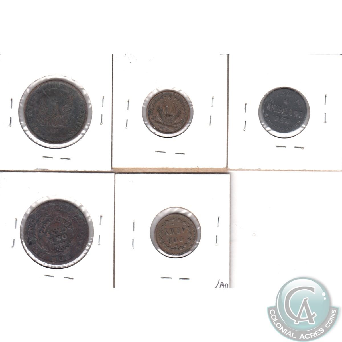 5x USA War Tokens: 1837 Hard times Not One Cent Token VF, 1863 Civil War Token AU, 1863 Broas Pie Ba
