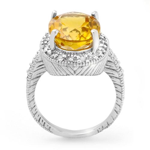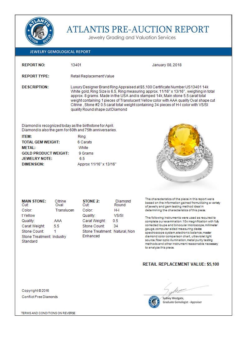 REF-77H3A -13401 ---- 6.0 CTW Citrine & Diamond Ring 14K White Gold ---- Luxury Designer Brand Ring Appraised at $5,100 Certificate Number US13401 14k White gold, Ring Size is 6.5, Ring measuring approx. 11/16" x 13/16" , weighing in total approx. 8 grams. Made in the USA and is stamped 14k, Main stone 5.5 carat total weight containing 1 pieces of Translucent Yellow color with AAA quality Oval shape cut Citrine , Stone #2 0.5 carat total weight containing 34 pieces of H-I color with VS/SI quality Round shape cut Diamond