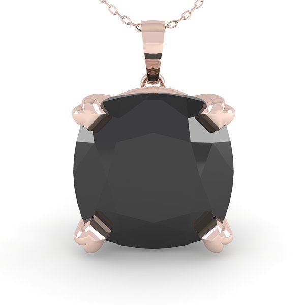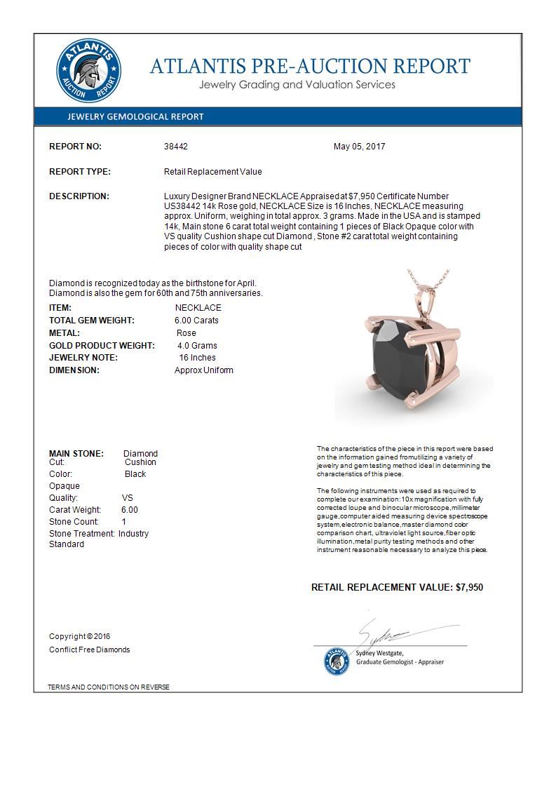 6.0 CTW Cushion Black Diamond Designer Necklace 14K Rose Gold ---- Luxury Designer Brand NECKLACE Appraised Retail Price at $7,950 ---- SKU Number US38442 14k Rose gold NECKLACE Size is 16 Inches, NECKLACE measuring approx. Uniform, weighing in total approx. 3 grams. Made in the USA and is stamped 14k, Main stone 6.00 carat total weight containing 1 pieces of Black Opaque color with VS quality Cushion shape cut Diamond , Stone #2 carat total weight containing pieces of color with quality shape cut