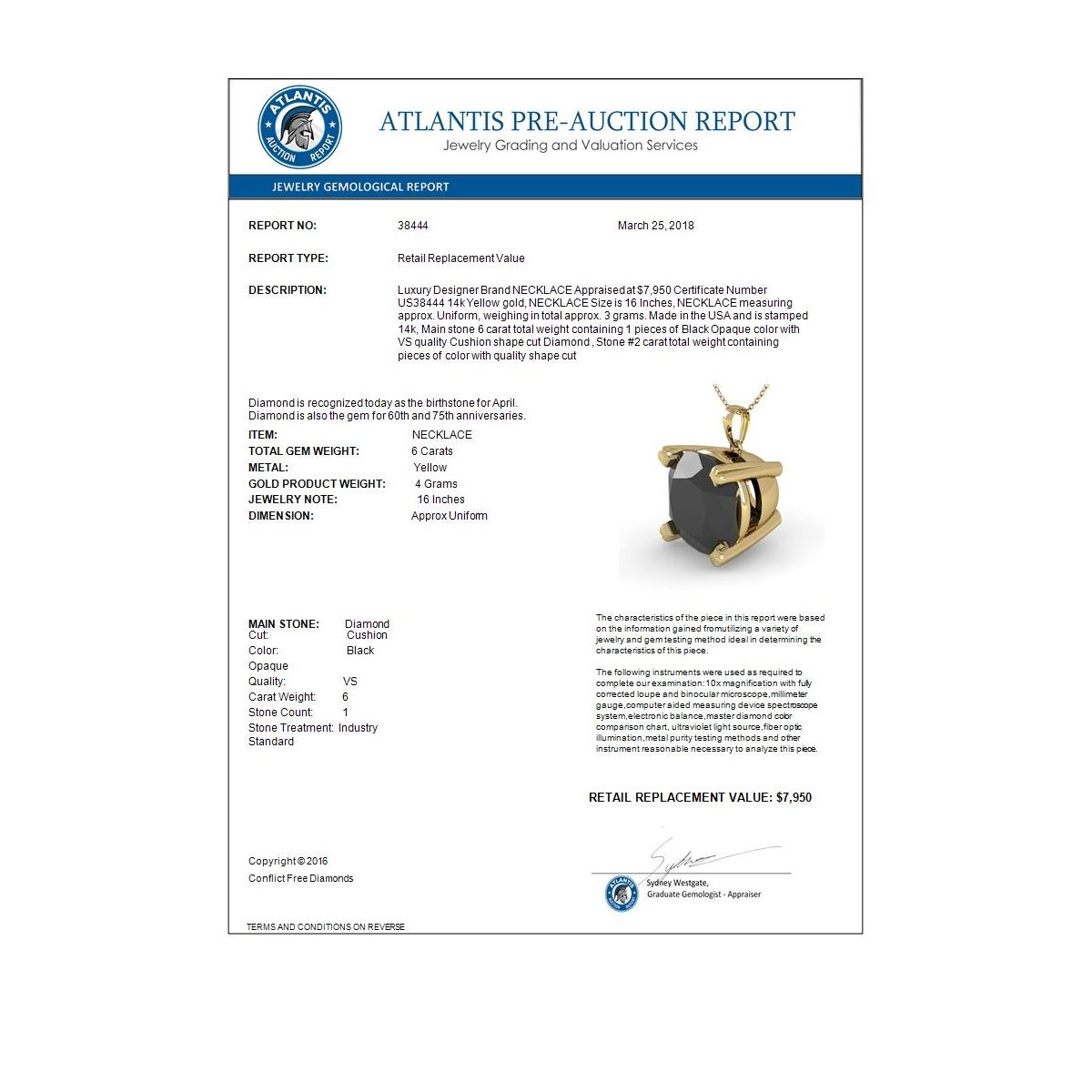 REF-131K3W -38444 ---- 6.0 CTW Cushion Black Diamond Designer Necklace 14K Yellow Gold ---- Luxury Designer Brand NECKLACE Appraised at $7,950 Certificate Number US38444 14k Yellow gold, NECKLACE Size is 16 Inches, NECKLACE measuring approx. Uniform, weighing in total approx. 3 grams. Made in the USA and is stamped 14k, Main stone 6 carat total weight containing 1 pieces of Black Opaque color with VS quality Cushion shape cut Diamond , Stone #2 carat total weight containing pieces of color with quality shape cut