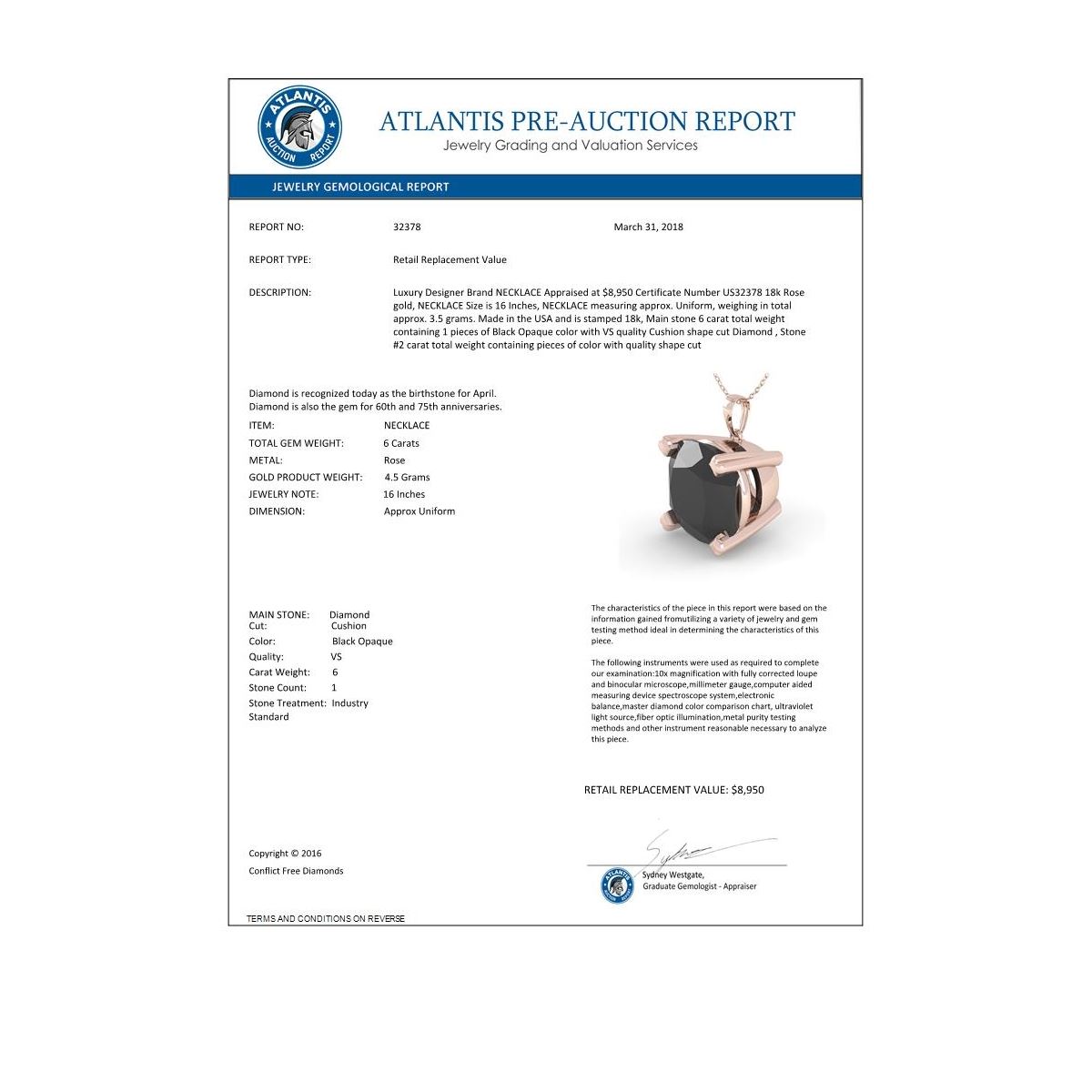 REF-147A8X -32378 ---- 6.0 CTW Cushion Black Diamond Designer Necklace 18K Rose Gold ---- Luxury Designer Brand NECKLACE Appraised at $8,950 Certificate Number US32378 18k Rose gold, NECKLACE Size is 16 Inches, NECKLACE measuring approx. Uniform, weighing in total approx. 3.5 grams. Made in the USA and is stamped 18k, Main stone 6 carat total weight containing 1 pieces of Black Opaque color with VS quality Cushion shape cut Diamond , Stone #2 carat total weight containing pieces of color with quality shape cut