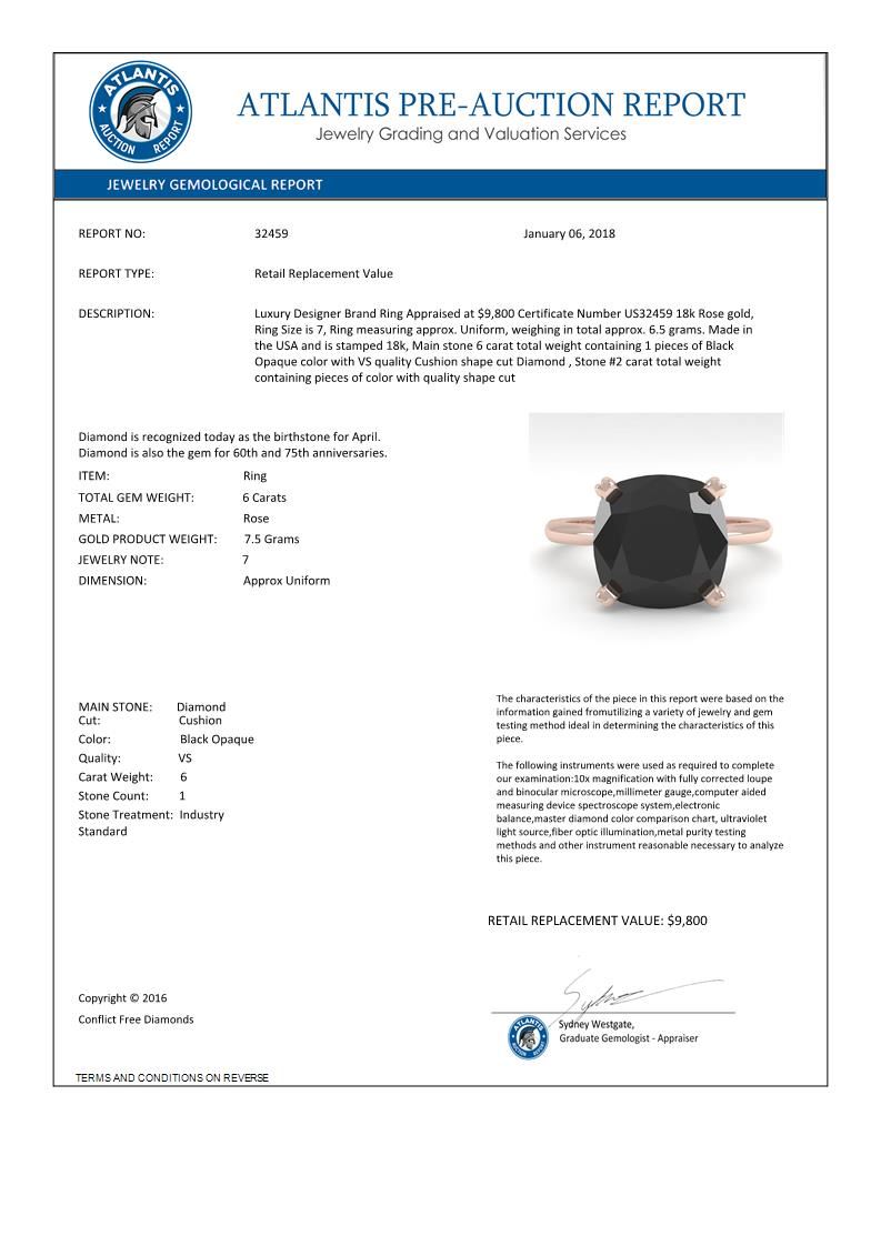 REF-162W2F -32459 ---- 6.0 CTW Cushion Black Diamond Engagement Designer Ring Size 7 18K Rose Gold ---- Luxury Designer Brand Ring Appraised at $9,800 Certificate Number US32459 18k Rose gold, Ring Size is 7, Ring measuring approx. Uniform, weighing in total approx. 6.5 grams. Made in the USA and is stamped 18k, Main stone 6 carat total weight containing 1 pieces of Black Opaque color with VS quality Cushion shape cut Diamond , Stone #2 carat total weight containing pieces of color with quality shape cut