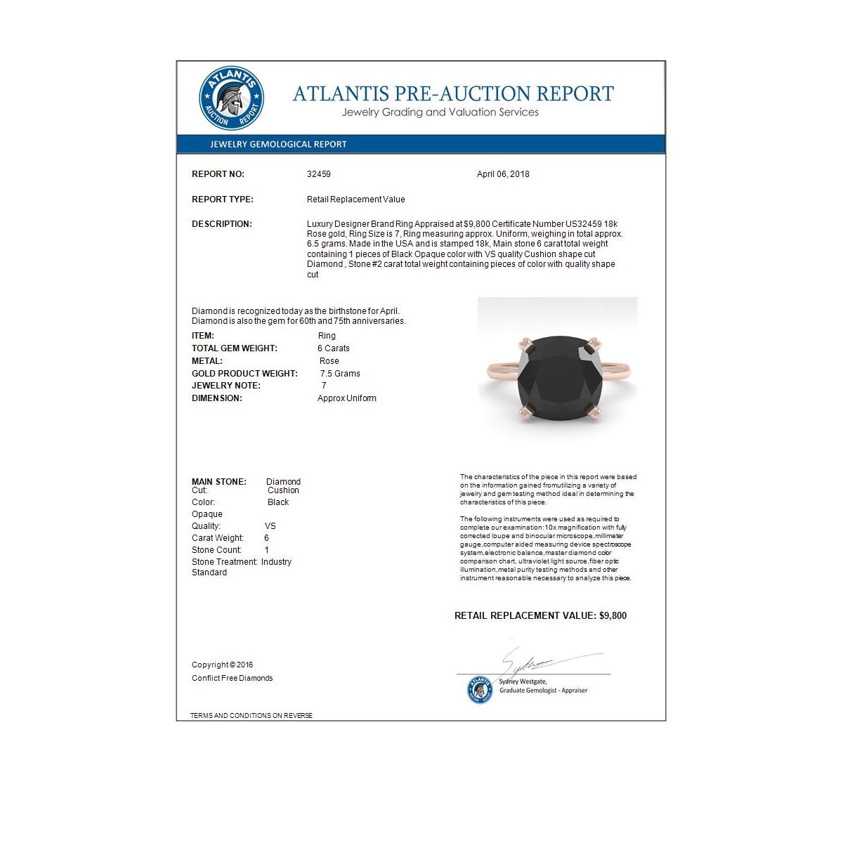 REF-162W2F -32459 ---- 6.0 CTW Cushion Black Diamond Engagement Designer Ring Size 7 18K Rose Gold ---- Luxury Designer Brand Ring Appraised at $9,800 Certificate Number US32459  18k Rose gold,  Ring Size is 7, Ring measuring approx. Uniform, weighing in total approx. 6.5 grams. Made in the USA and is stamped 18k, Main stone 6 carat total weight containing 1 pieces of Black Opaque color with VS quality Cushion shape cut Diamond , Stone #2  carat total weight containing  pieces of  color with quality  shape cut