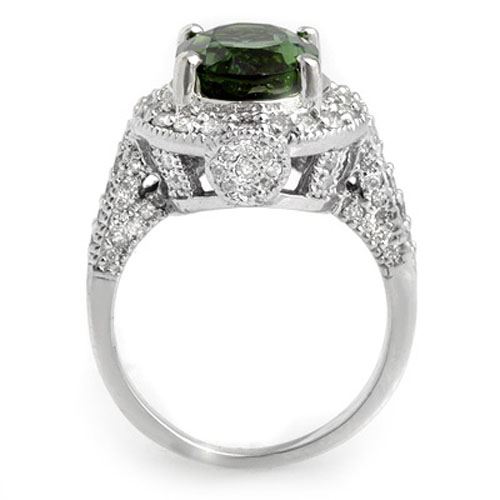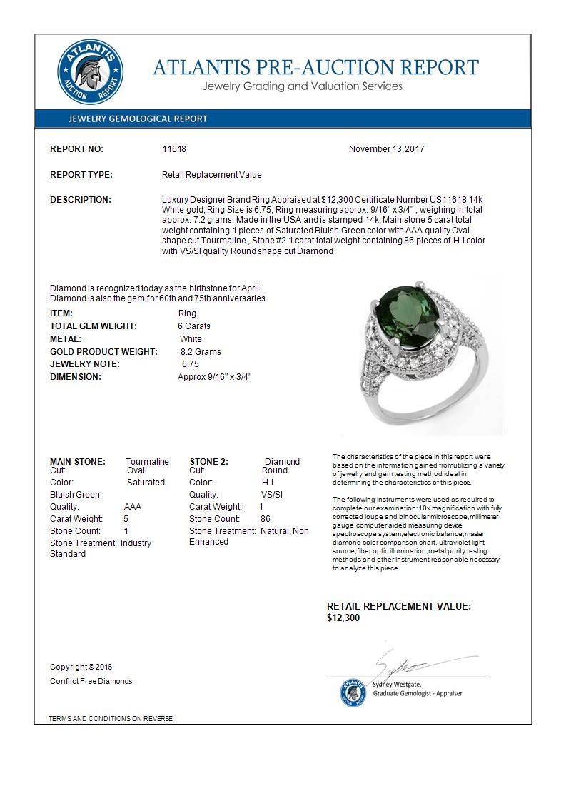 11618 - REF-160M2F ---- 6.0 CTW Green Tourmaline & Diamond Ring 14K White Gold ---- Luxury Designer Brand Ring Appraised at $12,300 Certificate Number US11618 14k White gold, Ring Size is 6.75, Ring measuring approx. 9/16" x 3/4" , weighing in total approx. 7.2 grams. Made in the USA and is stamped 14k, Main stone 5 carat total weight containing 1 pieces of Saturated Bluish Green color with AAA quality Oval shape cut Tourmaline , Stone #2 1 carat total weight containing 86 pieces of H-I color with VS/SI quality Round shape cut Diamond
