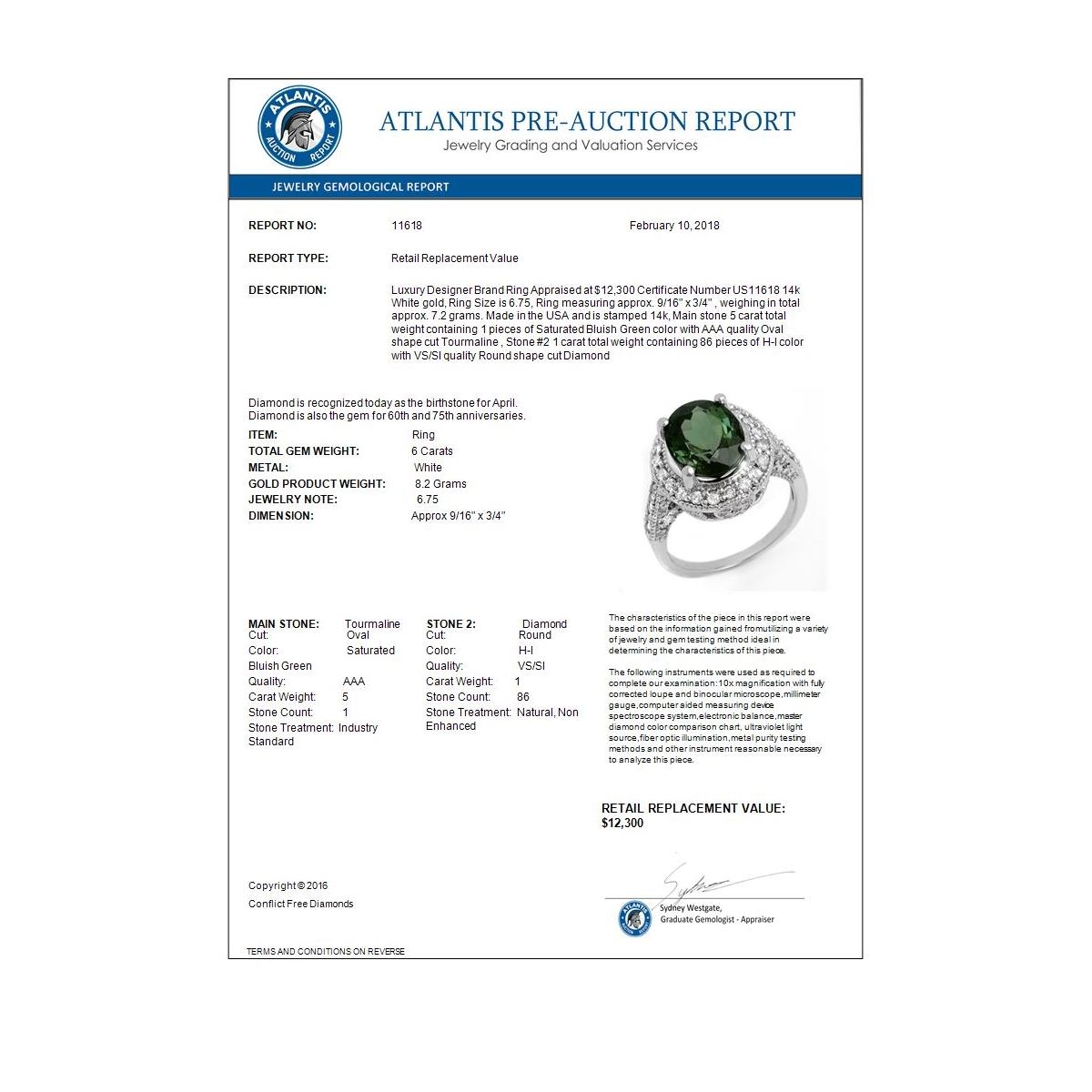 REF-160X2T -11618 ---- 6.0 CTW Green Tourmaline & Diamond Ring 14K White Gold ---- Luxury Designer Brand Ring Appraised at $12,300 Certificate Number US11618 14k White gold, Ring Size is 6.75, Ring measuring approx. 9/16" x 3/4" , weighing in total approx. 7.2 grams. Made in the USA and is stamped 14k, Main stone 5 carat total weight containing 1 pieces of Saturated Bluish Green color with AAA quality Oval shape cut Tourmaline , Stone #2 1 carat total weight containing 86 pieces of H-I color with VS/SI quality Round shape cut Diamond