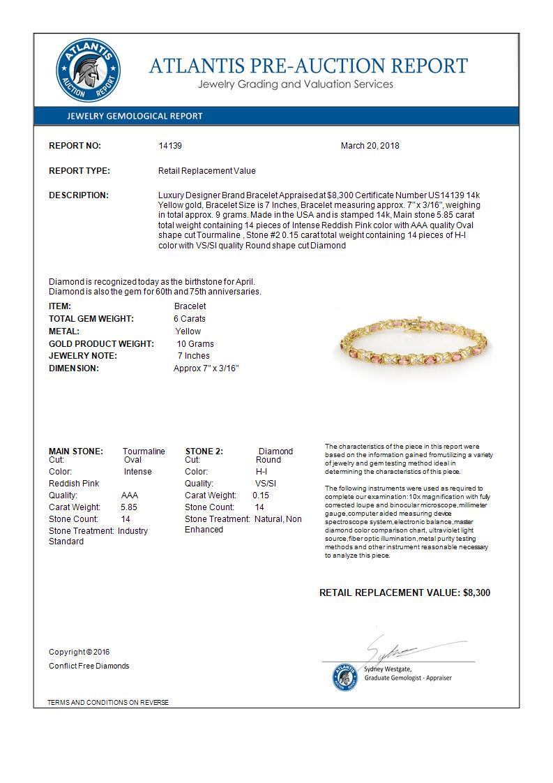 REF-108N2Y -14139 ---- 6.0 CTW Pink Tourmaline & Diamond Bracelet 14K Yellow Gold ---- Luxury Designer Brand Bracelet Appraised at $8,300 Certificate Number US14139 14k Yellow gold, Bracelet Size is 7 Inches, Bracelet measuring approx. 7" x 3/16", weighing in total approx. 9 grams. Made in the USA and is stamped 14k, Main stone 5.85 carat total weight containing 14 pieces of Intense Reddish Pink color with AAA quality Oval shape cut Tourmaline , Stone #2 0.15 carat total weight containing 14 pieces of H-I color with VS/SI quality Round shape cut Diamond