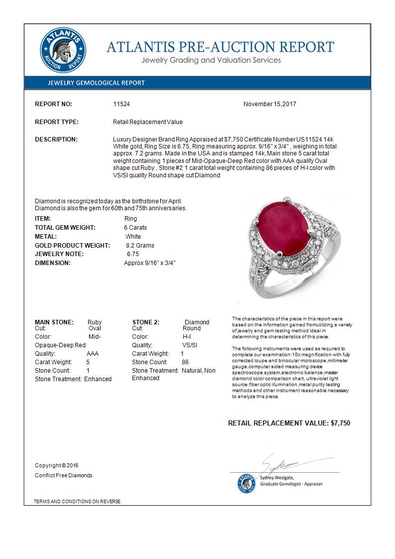 11524 - REF-100X9R ---- 6.0 CTW Ruby & Diamond Ring 14K White Gold ---- Luxury Designer Brand Ring Appraised at $7,750 Certificate Number US11524 14k White gold, Ring Size is 6.75, Ring measuring approx. 9/16" x 3/4" , weighing in total approx. 7.2 grams. Made in the USA and is stamped 14k, Main stone 5 carat total weight containing 1 pieces of Mid-Opaque-Deep Red color with AAA quality Oval shape cut Ruby , Stone #2 1 carat total weight containing 86 pieces of H-I color with VS/SI quality Round shape cut Diamond