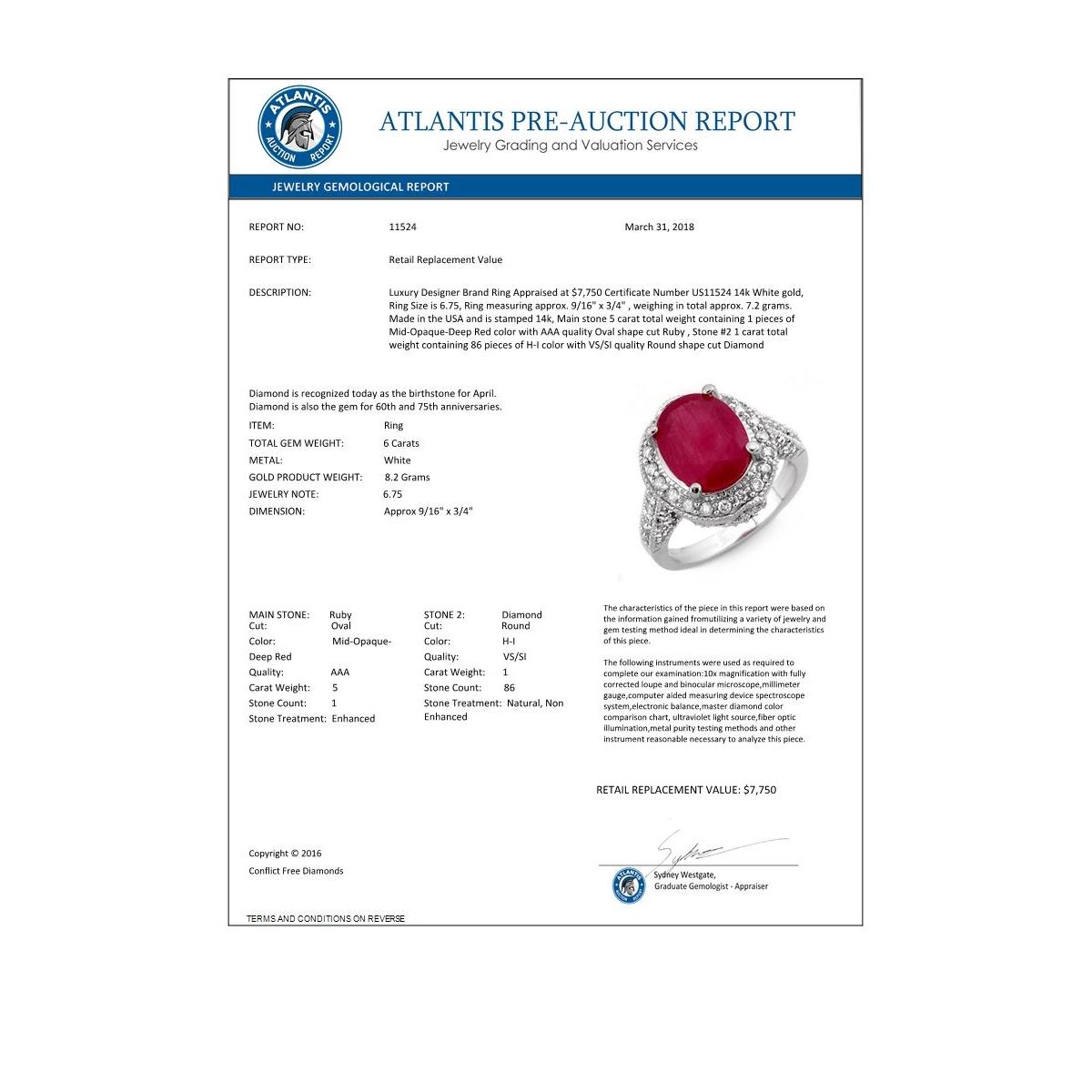 REF-100Y9K -11524 ---- 6.0 CTW Ruby & Diamond Ring 14K White Gold ---- Luxury Designer Brand Ring Appraised at $7,750 Certificate Number US11524 14k White gold, Ring Size is 6.75, Ring measuring approx. 9/16" x 3/4" , weighing in total approx. 7.2 grams. Made in the USA and is stamped 14k, Main stone 5 carat total weight containing 1 pieces of Mid-Opaque-Deep Red color with AAA quality Oval shape cut Ruby , Stone #2 1 carat total weight containing 86 pieces of H-I color with VS/SI quality Round shape cut Diamond