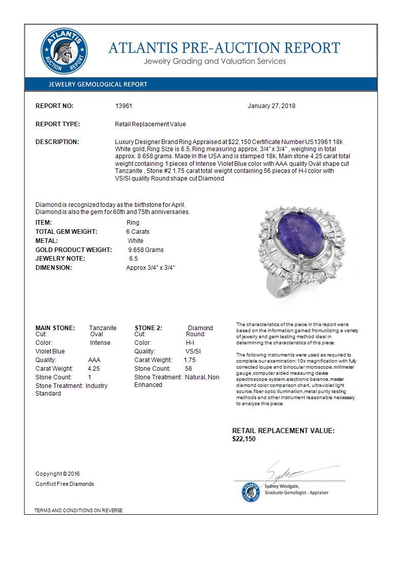REF-287N6Y -13961 ---- 6.0 CTW Tanzanite & Diamond Ring 18K White Gold ---- Luxury Designer Brand Ring Appraised at $22,150 Certificate Number US13961 18k White gold, Ring Size is 6.5, Ring measuring approx. 3/4" x 3/4" , weighing in total approx. 8.658 grams. Made in the USA and is stamped 18k, Main stone 4.25 carat total weight containing 1 pieces of Intense Violet Blue color with AAA quality Oval shape cut Tanzanite , Stone #2 1.75 carat total weight containing 56 pieces of H-I color with VS/SI quality Round shape cut Diamond