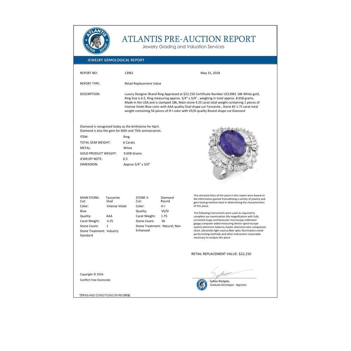 REF-287N6Y -13961 ---- 6.0 CTW Tanzanite & Diamond Ring 18K White Gold ---- Luxury Designer Brand Ring Appraised at $22,150 Certificate Number US13961 18k White gold, Ring Size is 6.5, Ring measuring approx. 3/4" x 3/4" , weighing in total approx. 8.658 grams. Made in the USA and is stamped 18k, Main stone 4.25 carat total weight containing 1 pieces of Intense Violet Blue color with AAA quality Oval shape cut Tanzanite , Stone #2 1.75 carat total weight containing 56 pieces of H-I color with VS/SI quality Round shape cut Diamond