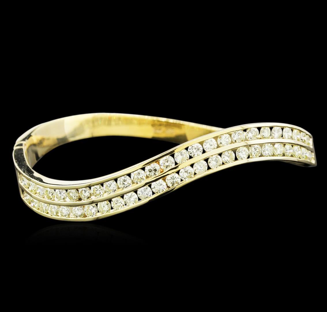 One electronically tested 14KT yellow gold lady's combination cast & assembled fashion bangle bracelet with a tongue clasp with foldover safety with a bright polish finish. The featured lady's bangle bracelet contains two rows of diamonds and has an internal circumference of approximately 6.5 inches. Identified with markings of "14K 585". Condition is new, good workmanship. Containing: Fifty channel set round brilliant cut diamonds, measuring 3.20 - 3.10 x 1.95mm (depth est.) approximate total weight of 50 Stones = 6.00ct. Graded in the setting. Clarity: SI-1 to I-1. Color: L - M. Cut Good. Total Weight of Diamonds 6.00ct. Total Weight of Bangle Bracelet 21.30gm. GAS Appraised at $6,795.00.