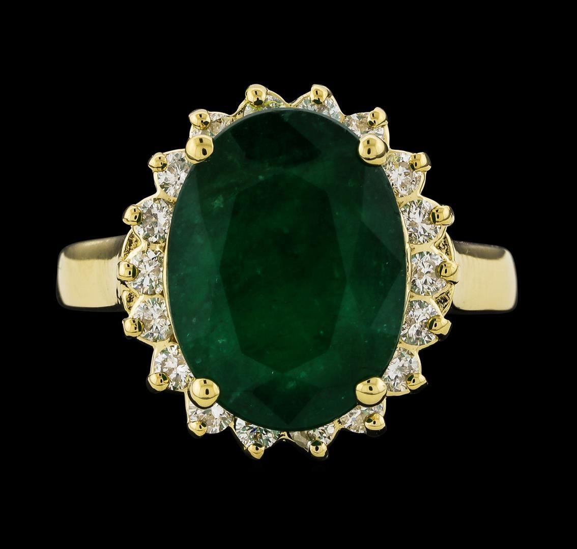 One electronically tested 14KT yellow gold lady's cast fashion ring with a basket halo with a bright polish finish. The featured lady's ring has a shank measuring 2.23 millimeters wide. Identified with markings of '14K'. Condition is new, good workmanship. Containing: One prong set oval modified mixed cut natural emerald, measuring 13.50 x 10.05 x 6.73mm, (depth est.) 15%. bulge factor, approximate weight of 6.00ct., clarity is heavily included, medium dark, moderately strong, green color, (GIA G 6/4), cut is good. Transmitting light somewhat diffusely, semi-transparent to translucent. Naturally occurring internal & external characteristics are present. Indications of oil residue. Colored gemstones are presumed to have been subjected to commonly used enhancement processes. Graded in the setting. Eighteen prong set round brilliant cut diamonds, measuring 2.00 - 1.90 x 1.19mm (depth est.) approximate total weight of 18 Stones = 0.50ct. Graded in the setting. Clarity SI-1 to SI-2. Color: G - I Cut Good. Total Weight of Colored Stones 6.00ct.. Total Weight of Diamonds 0.50ct.. Total Weight of Ring 6.50gm GAS Appraised.