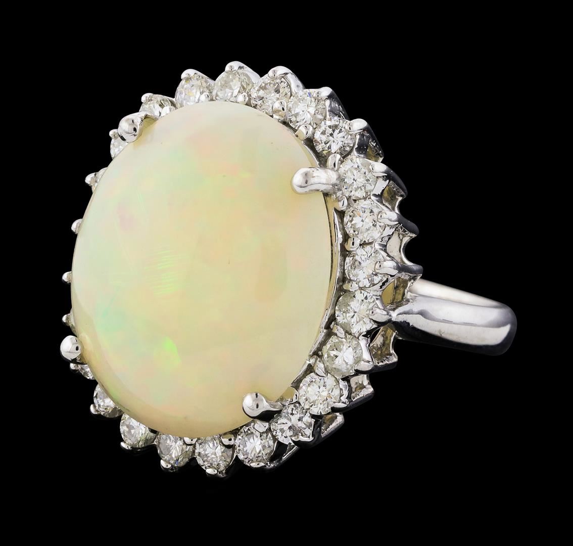 One Opal and Diamond Ring featuring: 14KT White Gold with a total weight of 6.99 grams, Opal with a total weight of 6.00ct, and side diamonds with a total weight of 1.07ctw.