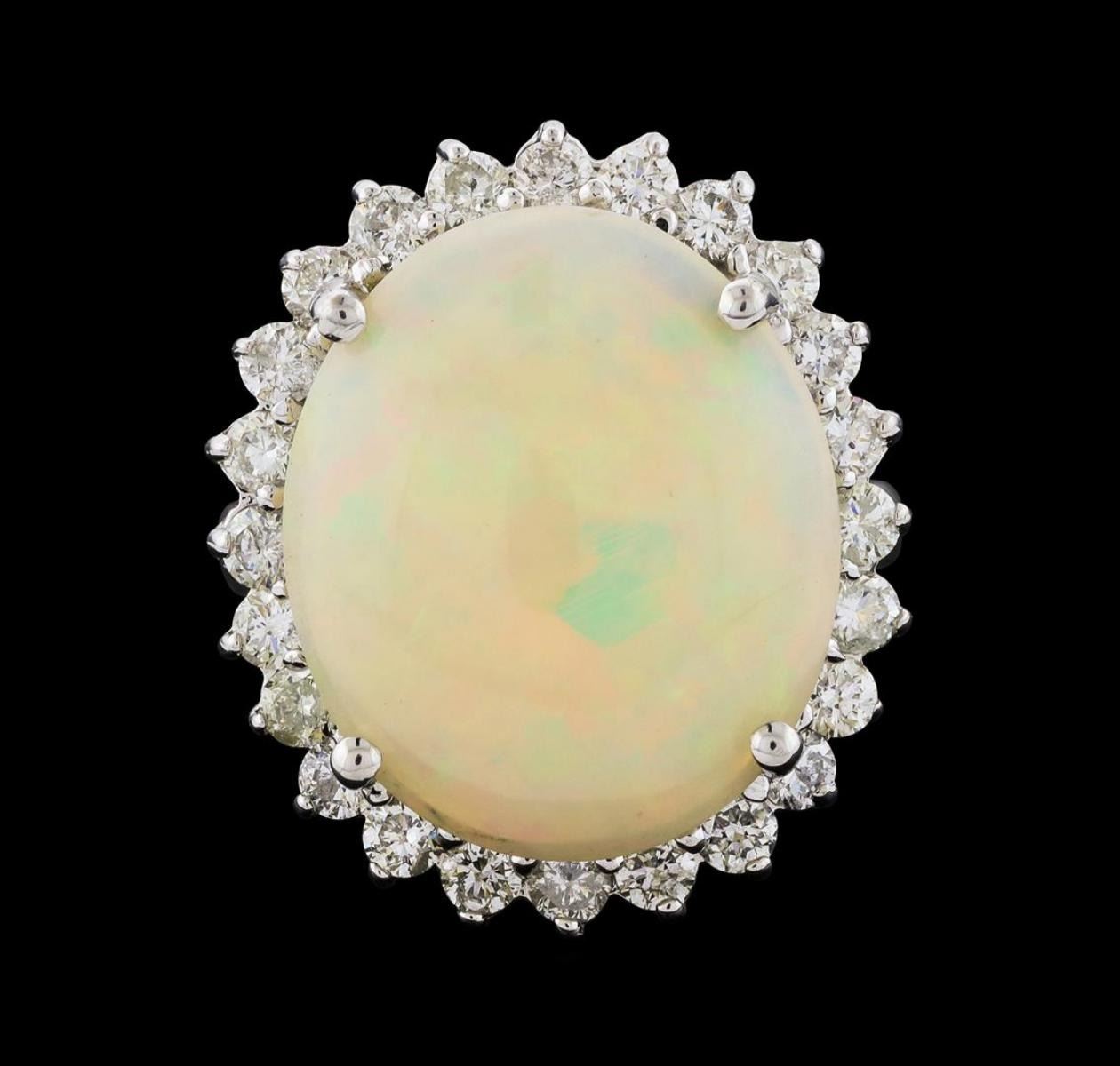 One Opal and Diamond Ring featuring: 14KT White Gold with a total weight of 6.99 grams, Opal with a total weight of 6.00ct, and side diamonds with a total weight of 1.07ctw.