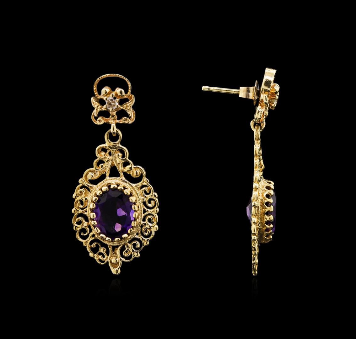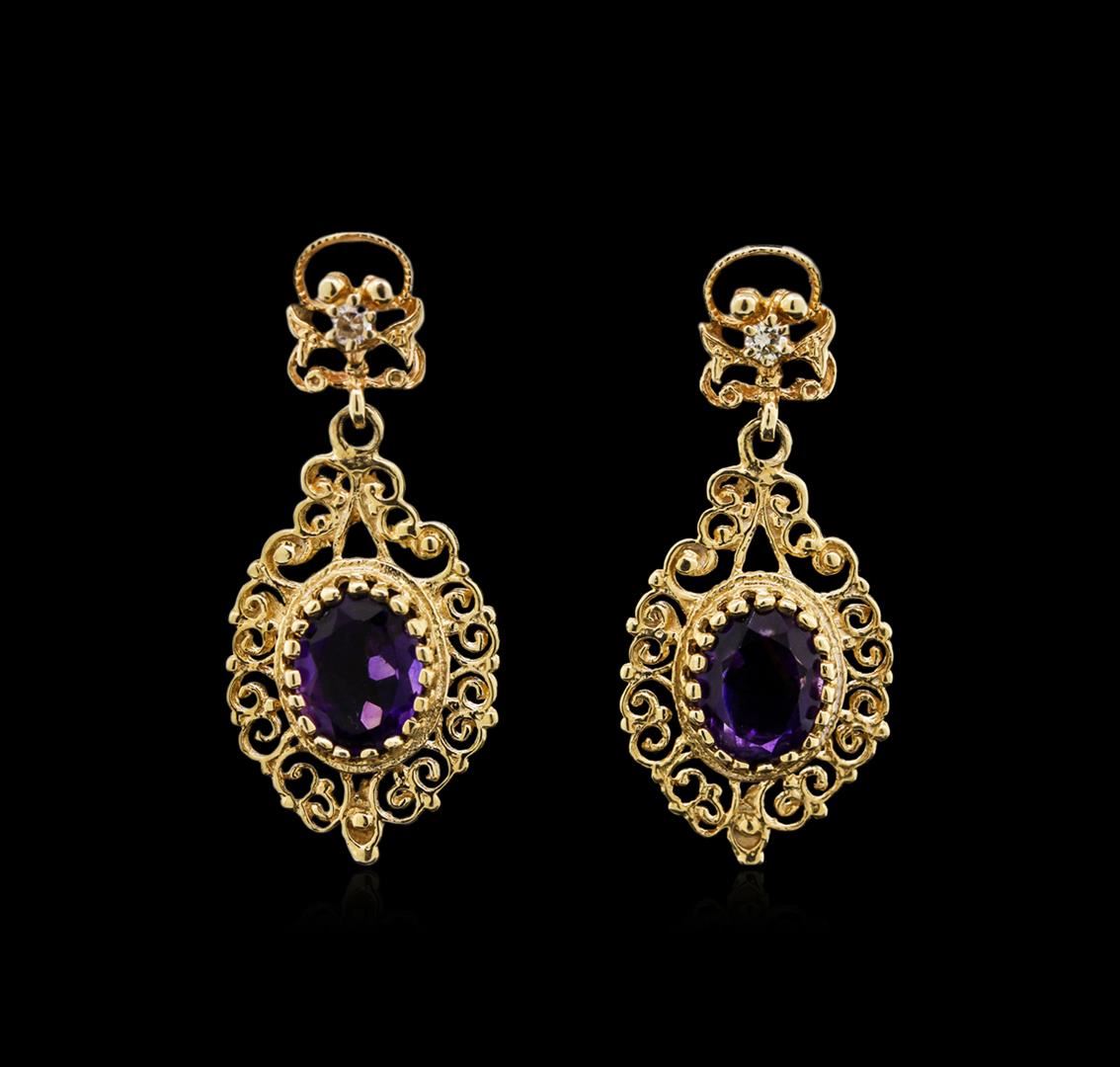 6.00ctw Amethyst and Diamond Earrings- 14KT Yellow Gold. 5.8 grams total weight; 2 amethysts: 3 cts each= 6 cts total; 2 diamonds: .05 pts each = .10 pts total.
