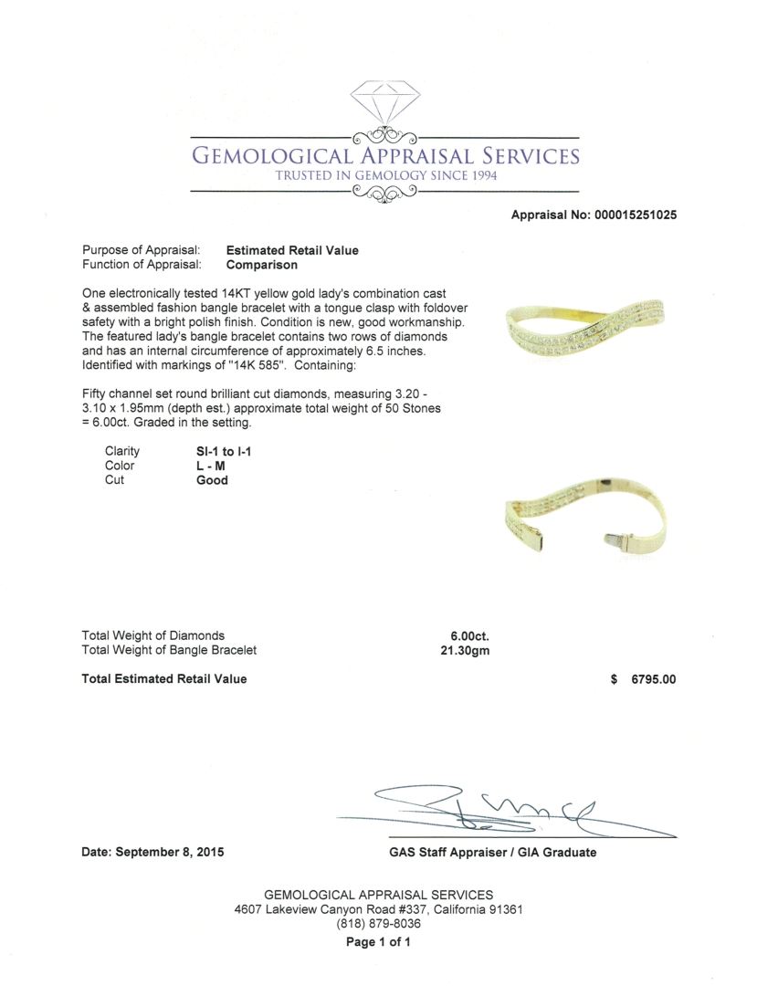 One electronically tested 14KT yellow gold lady's combination cast & assembled fashion bangle bracelet with a tongue clasp with foldover safety with a bright polish finish. The featured lady's bangle bracelet contains two rows of diamonds and has an internal circumference of approximately 6.5 inches. Identified with markings of "14K 585". Condition is new, good workmanship. Containing: Fifty channel set round brilliant cut diamonds, measuring 3.20 - 3.10 x 1.95mm (depth est.) approximate total weight of 50 Stones = 6.00ct. Graded in the setting. Clarity: SI-1 to I-1. Color: L - M. Cut Good. Total Weight of Diamonds 6.00ct. Total Weight of Bangle Bracelet 21.30gm. GAS Appraised at $6,795.00.