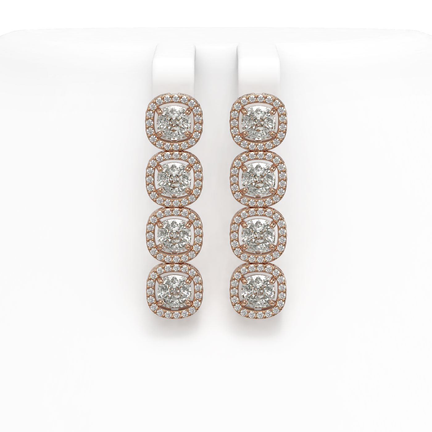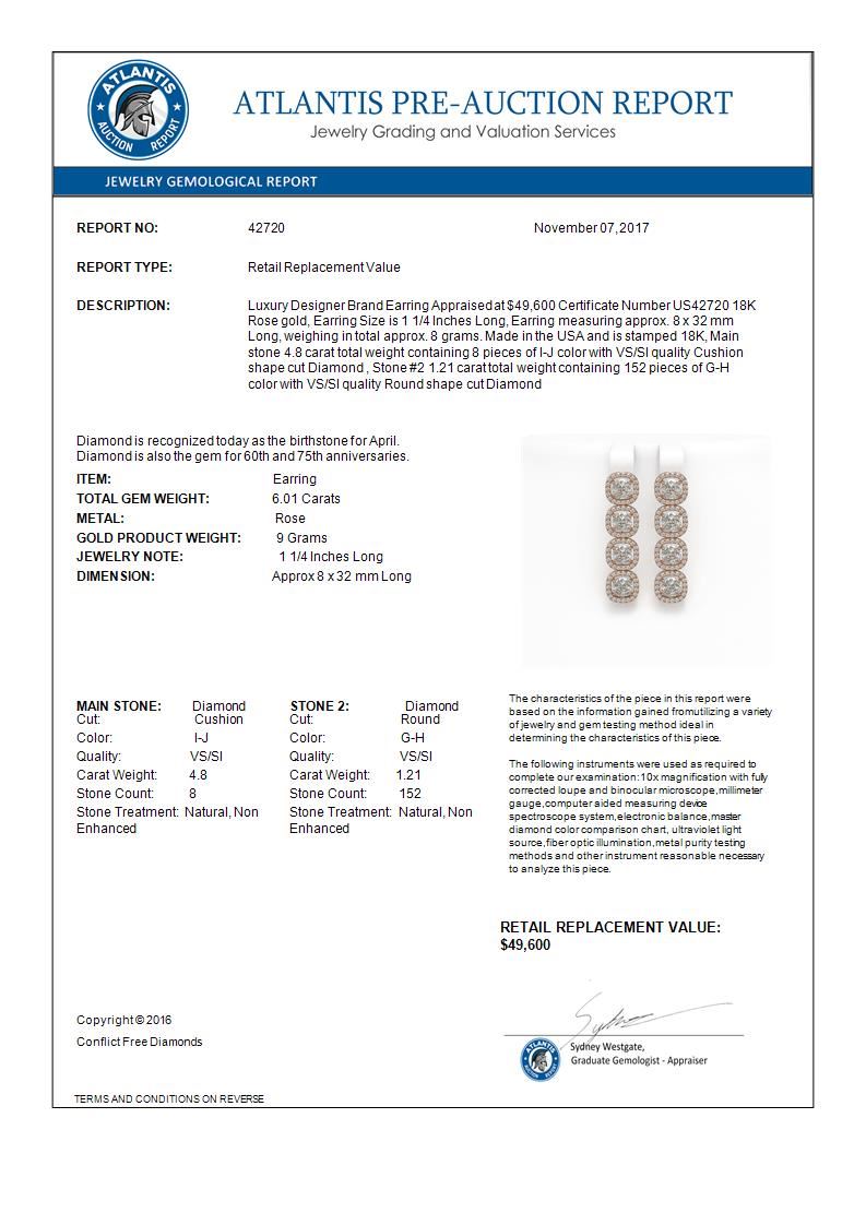 REF-1127H6A -42720 ---- 6.01 CTW Cushion Diamond Designer Earrings 18K Rose Gold ---- Luxury Designer Brand Earring Appraised at $49,600 Certificate Number US42720 18K Rose gold, Earring Size is 1 1/4 Inches Long, Earring measuring approx. 8 x 32 mm Long, weighing in total approx. 8 grams. Made in the USA and is stamped 18K, Main stone 4.8 carat total weight containing 8 pieces of I-J color with VS/SI quality Cushion shape cut Diamond , Stone #2 1.21 carat total weight containing 152 pieces of G-H color with VS/SI quality Round shape cut Diamond