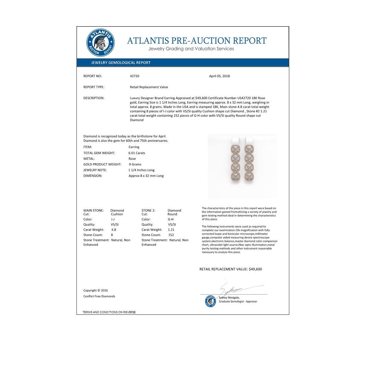 REF-1127H6A -42720 ---- 6.01 CTW Cushion Diamond Designer Earrings 18K Rose Gold ---- Luxury Designer Brand Earring Appraised at $49,600 Certificate Number US42720 18K Rose gold, Earring Size is 1 1/4 Inches Long, Earring measuring approx. 8 x 32 mm Long, weighing in total approx. 8 grams. Made in the USA and is stamped 18K, Main stone 4.8 carat total weight containing 8 pieces of I-J color with VS/SI quality Cushion shape cut Diamond , Stone #2 1.21 carat total weight containing 152 pieces of G-H color with VS/SI quality Round shape cut Diamond