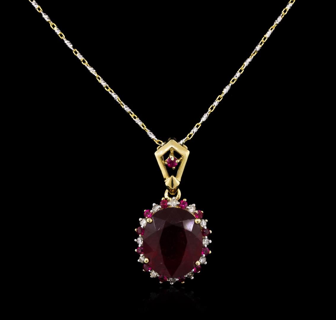 Fourteen karat (14K) two tone gold ruby and diamond pendant. An oval cut ruby corundum gemstone is prong mounted in the center of the pendant. Round brilliant cut diamonds and round cut ruby gemstones accent the pendant around the center gemstone and on the top bail. The pendant is cast stamped "14K" and has a gross weight of 4.9 Grams. Diamond(s): Shape: Round Brilliant Cut. Weight: 0.16 carat. Average Clarity: I1. Average Color: H-J. Symmetry: Very Good. Polish: Very Good. GemStone(s): GemStone: Ruby Corundum. Nature: Natural. Shape: Oval and Round, Faceted. Weight: 6.01 carat total. Center Gemstone Dimensions: Length- 11.86 mm. ; Width- 10.15 mm. Bulge: Visible. Clarity: I1, Type 2. Color: Red (5/5). Symmetry: Very Good. Color Intensity: Medium. Transparency: Transparent. Tone: Dark. Enhancements: Indications of high temperature heat treatment, with glass and flux additives. Metal(s): Metal: Gold, Stamped. Purity: 14K. Color: Two Tone. Condition: Excellent. Finish: High polish. GGA Appraised.