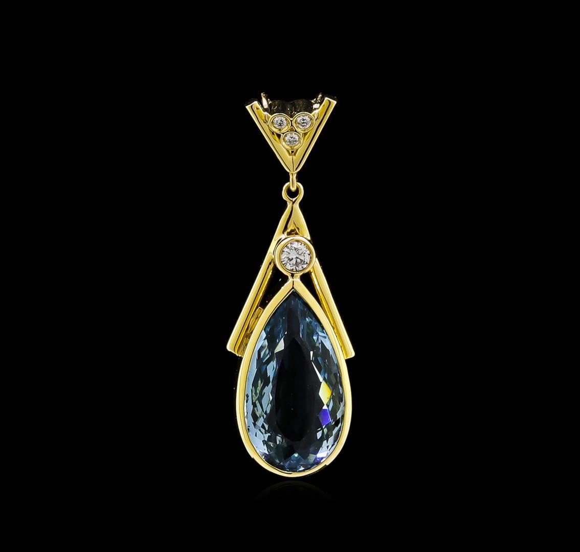 One electronically tested 18KT yellow gold lady's combination cast & assembled fashion pendant with a bright polish finish. Identified with markings of "18K". Condition is new, good workmanship. Containing: One bezel set pear modified brilliant cut natural aquamarine, measuring 17.50 x 9.50 x 6.30mm, 5%. bulge factor, approximate weight of 6.02ct., clarity is eye clean, type I, medium, moderately strong, greenish blue color, (GIA gB 5/4), cut is excellent. Colored gemstones are presumed to have been subjected to commonly used enhancement processes. Graded in the setting. One bezel set round brilliant cut diamond, measuring 3.00 - 2.95 x 1.85mm (depth est.) approximate weight of 0.10ct. Graded in the setting. Clarity: VS-1. Color: Very Good Three bezel set round brilliant cut diamonds, measuring 1.50 - 1.45 x 0.90mm (depth est.) approximate total weight of 3 Stones = 0.04ct. Graded in the setting. Clarity: VS-1 to VS-2. Color: G - Very Good. Total Weight of Colored Stones 6.02ct. Total Weight of Diamonds 0.14ct. Total Weight of Pendant 5.60gm. GAS Appraised at $8,555.00.