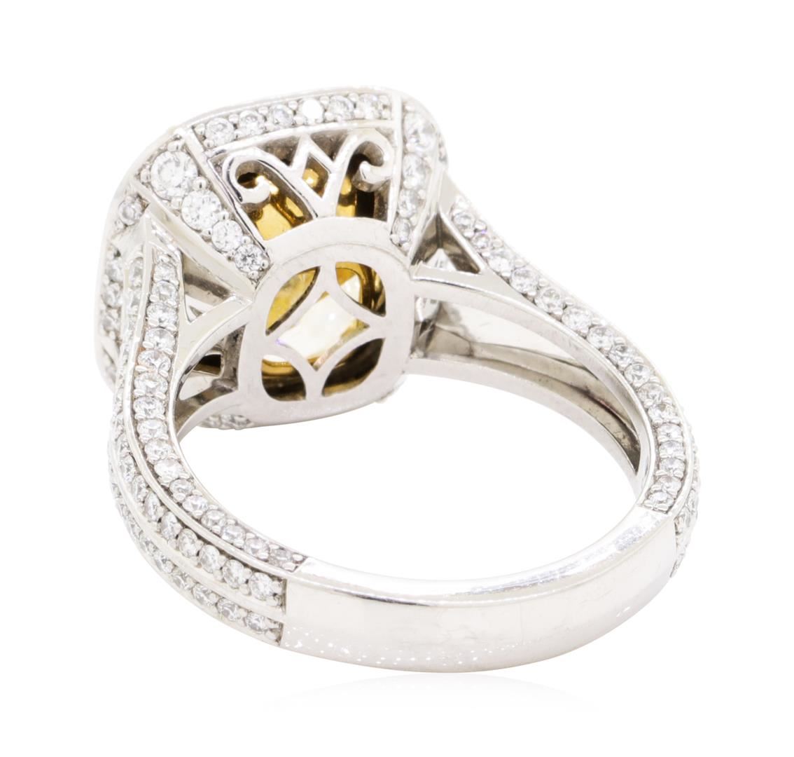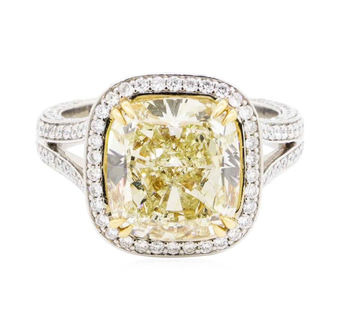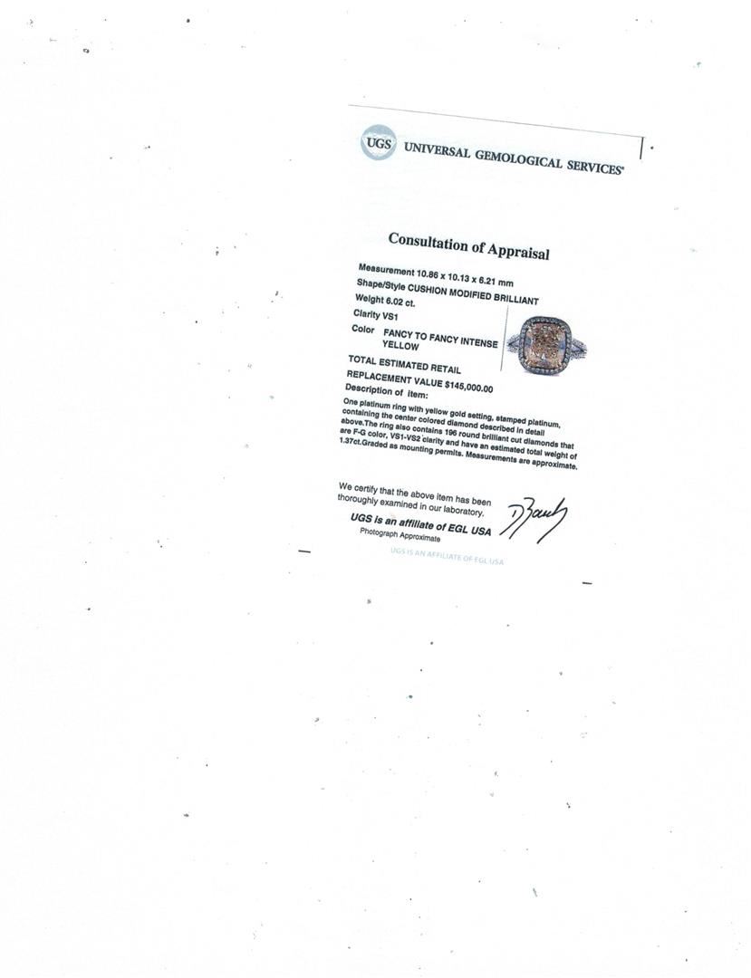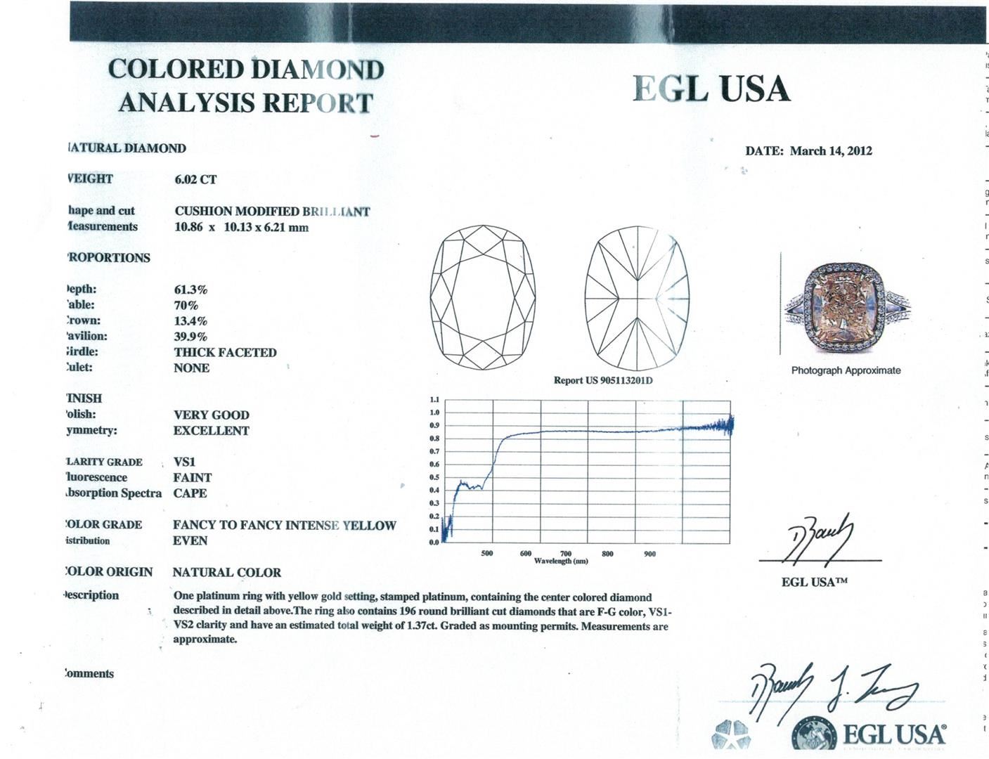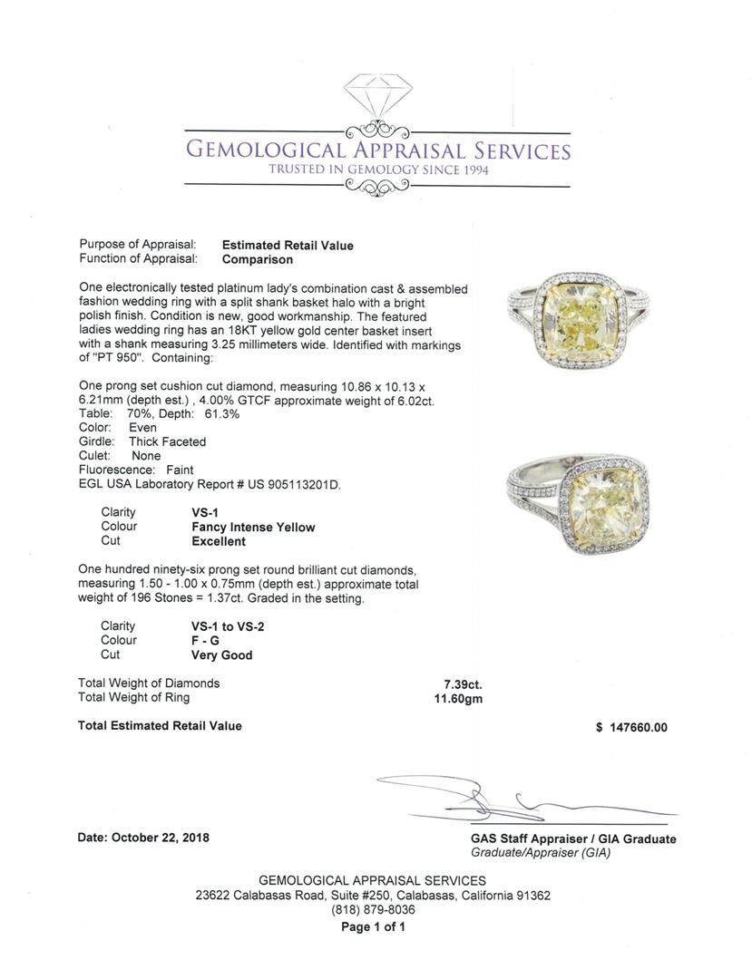 One electronically tested platinum lady's combination cast & assembled fashion wedding ring with a split shank basket halo with a bright polish finish. The featured ladies wedding ring has an 18KT yellow gold center basket insert with a shank measuring 3.25 millimeters wide. Identified with markings of 'PT 950'. Condition is new, good workmanship. Containing: One prong set cushion cut diamond, measuring 10.86 x 10.13 x 6.21mm (depth est.) , 4.00.%. GTCF approximate weight of 6.02ct. Table: 70%. , Depth: 61.3%. Color: EvenGirdle: Thick FacetedCulet: NoneFluorescence: FaintEGL USA Laboratory Report # US 905113201D. Colour Fancy Intense Yellow Clarity VS-1 Cut Excellent One Hundred Ninety-Six prong set round brilliant cut diamonds, measuring 1.50 - 1.00 x 0.75mm (depth est.) approximate total weight of 196 Stones = 1.37ct. Graded in the setting. Colour F - G Clarity VS-1 to VS-2 Cut Very Good. Total Weight of Diamonds 7.39ct.. Total Weight of Ring 11.60gm GAS Appraised at $147660.00. GAS Appraised at $147,660.00.