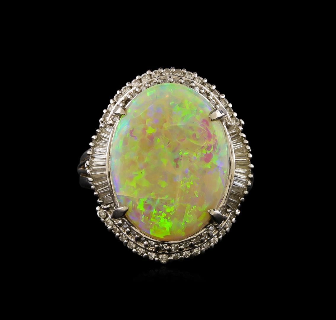 One electronically tested platinum ladies cast opal and diamond ring with a bright polish finish. The featured opal is set within a stylized diamond bezel supported by a filigree lattice under gallery and tapering four-way split shoulders, completed by a two millimeter wide band. Identified with markings of 'Pt900'. Condition is good. Containing: One semi crystal opal that is cut in a oval shaped cabochon and is prong set, measuring 17.70 mm long x 13.30 mm wide, and 4.10 mm thick and the approximate weight is 6.02 carats. The opal has a bright, multicolor play of color (fire) in a flashfire pattern; a low dome; a good cut; slightly included; slight variation in base in its brightness and pattern; and is slightly directional. Graded in the setting. Twenty-Two prong & channel set baguette cut (tapered) diamonds, measuring from 1.60 x 0.70 x 0.49mm (depth est.) to 2.00 x 1.10 x 0.77mm (depth est.) approximate total weight of 22 Stones = 0.21ct. The clarity grade reflects the entire range of clarity for this group. Graded in the setting. Clarity VS-2 to I-1. Color: H - J Sixty prong set round brilliant cut diamonds, measuring 1.20 - 1.10 x 0.69mm (depth est.) approximate total weight of 60 Stones = 0.39ct. The color and clarity grades reflect the entire range of color and clarity for this group. Graded in the setting. Clarity SI-1 to I-2. Color: G - J. Total Weight of Diamonds 0.60ct.. Total Weight of Opals 6.02ct.. Total Weight of Ring 10.00gm. AIG Appraised at $5,710.00.