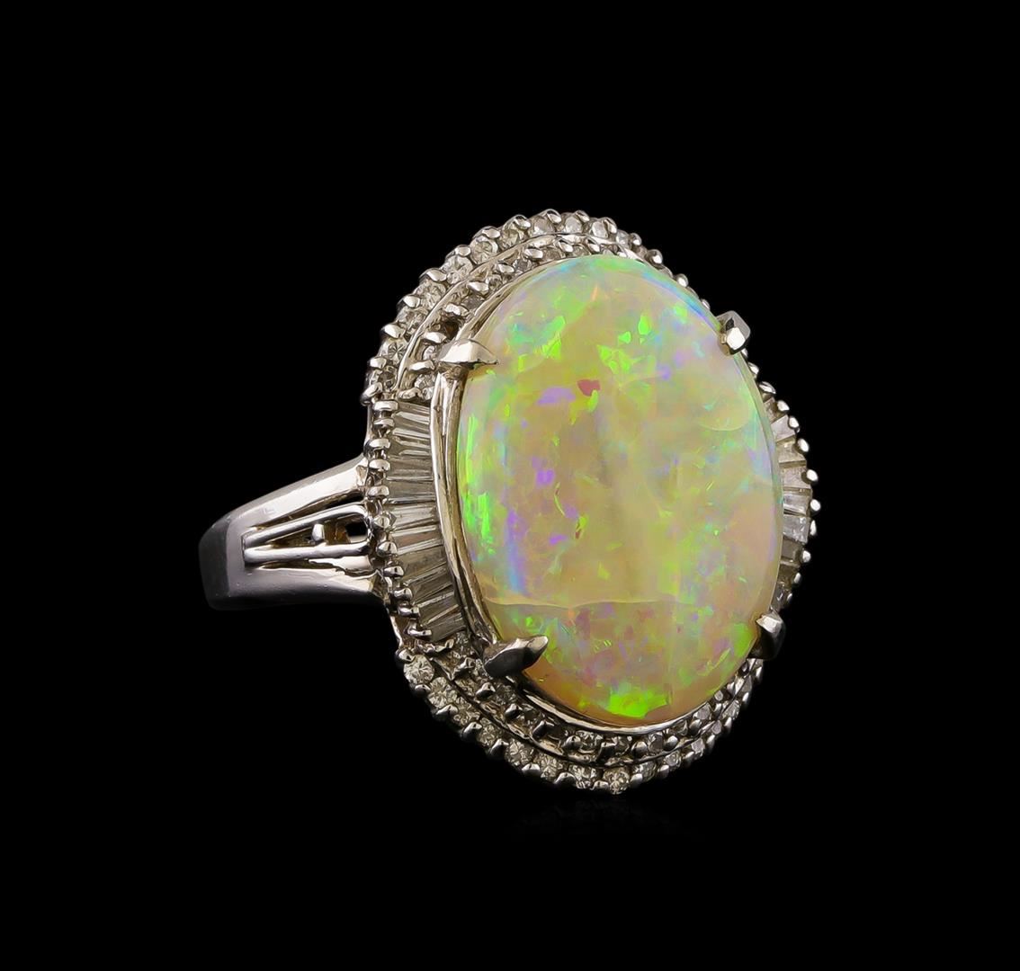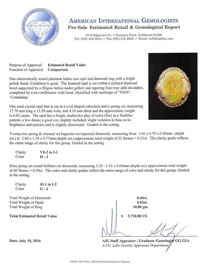One electronically tested platinum ladies cast opal and diamond ring with a bright polish finish. The featured opal is set within a stylized diamond bezel supported by a filigree lattice under gallery and tapering four-way split shoulders, completed by a two millimeter wide band. Identified with markings of 'Pt900'. Condition is good. Containing: One semi crystal opal that is cut in a oval shaped cabochon and is prong set, measuring 17.70 mm long x 13.30 mm wide, and 4.10 mm thick and the approximate weight is 6.02 carats. The opal has a bright, multicolor play of color (fire) in a flashfire pattern; a low dome; a good cut; slightly included; slight variation in base in its brightness and pattern; and is slightly directional. Graded in the setting. Twenty-Two prong & channel set baguette cut (tapered) diamonds, measuring from 1.60 x 0.70 x 0.49mm (depth est.) to 2.00 x 1.10 x 0.77mm (depth est.) approximate total weight of 22 Stones = 0.21ct. The clarity grade reflects the entire range of clarity for this group. Graded in the setting. Clarity VS-2 to I-1. Color: H - J Sixty prong set round brilliant cut diamonds, measuring 1.20 - 1.10 x 0.69mm (depth est.) approximate total weight of 60 Stones = 0.39ct. The color and clarity grades reflect the entire range of color and clarity for this group. Graded in the setting. Clarity SI-1 to I-2. Color: G - J. Total Weight of Diamonds 0.60ct.. Total Weight of Opals 6.02ct.. Total Weight of Ring 10.00gm. AIG Appraised at $5,710.00.